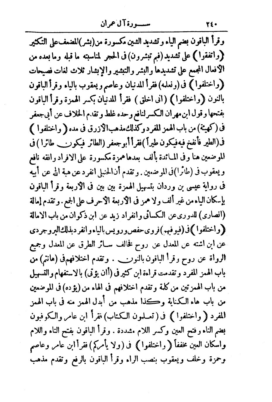 (وَاخْتَلَفُوا) فِي: فَيُوَفِّيهِمْ، فَرَوَى حَفْصٌ وَرُوَيْسٌ بِالْيَاءِ، وَانْفَرَدَ بِذَلِكَ الْبُرُوجِرْدِيُّ عَنِ ابْنِ أَشْتَةَ عَنِ الْمُعَدَّلِ عَنْ رَوْحٍ فَخَالَفَ سَائِرَ الطُّرُقِ عَنِ الْمُعَدَّلِ وَجَمِيعَ الرُّوَاةِ عَنْ رَوْحٍ، وَقَرَأَ الْبَاقُونَ بِالنُّونِ، وَتَقَدَّمَ اخْتِلَافُهُمْ فِي هَا أَنْتُمْ مِنْ بَابِ الْهَمْزِ الْمُفْرَدِ، وَتَقَدَّمَتْ قِرَاءَةُ ابْنِ كَثِيرٍ فِي أَنْ يُؤْتَى بِالِاسْتِفْهَامِ وَالتَّسْهِيلِ مِنْ بَابِ الْهَمْزَتَيْنِ مِنْ كَلِمَةٍ. وَتَقَدَّمَ اخْتِلَافُهُمْ فِي الْهَاءِ مِنْ يُؤَدِّهِ فِي الْمَوْضِعَيْنِ مِنْ بَابِ هَاءِ الْكِنَايَةِ، وَكَذَا مَذْهَبُ مَنْ أَبْدَلَ الْهَمْزَ مِنْهُ فِي بَابِ الْهَمْزِ الْمُفْرَدِ.