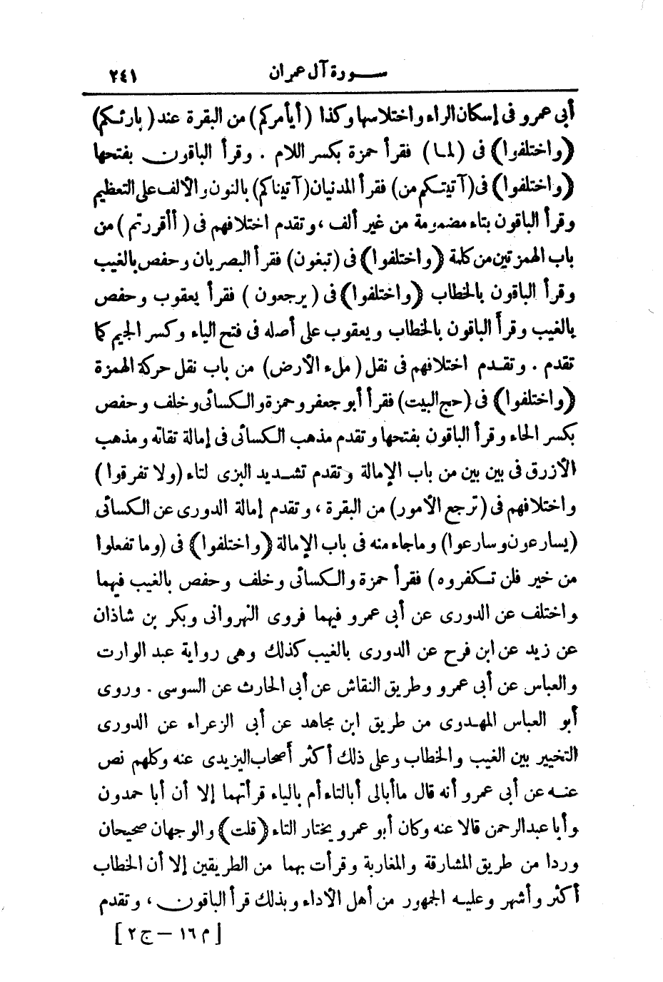 (وَاخْتَلَفُوا) فِي: حَجَّ الْبَيْتَ فَقَرَأَ أَبُو جَعْفَرٍ وَحَمْزَةُ وَالْكِسَائِيُّ وَخَلَفٌ وَحَفْصٌ بِكَسْرِ الْحَاءِ، وَقَرَأَ الْبَاقُونَ بِفَتْحِهَا، وَتَقَدَّمَ مَذْهَبُ الْكِسَائِيِّ فِي إِمَالَةِ تُقَاتِهِ وَمَذْهَبُ الْأَزْرَقِ فِي بَيْنَ بَيْنَ مِنْ بَابِ الْإِمَالَةِ، وَتَقَدَّمَ تَشْدِيدُ الْبَزِّيِّ لِتَاءِ (وَلَا تَفَرَّقُوا) وَاخْتِلَافُهُمْ فِي تُرْجَعُ الْأُمُورُ مِنَ الْبَقَرَةِ، وَتَقَدَّمَ إِمَالَةُ الدُّورِيِّ عَنِ الْكِسَائِيِّ يُسَارِعُونَ وَسَارِعُوا وَمَا جَاءَ مِنْهُ فِي بَابِ الْإِمَالَةِ.