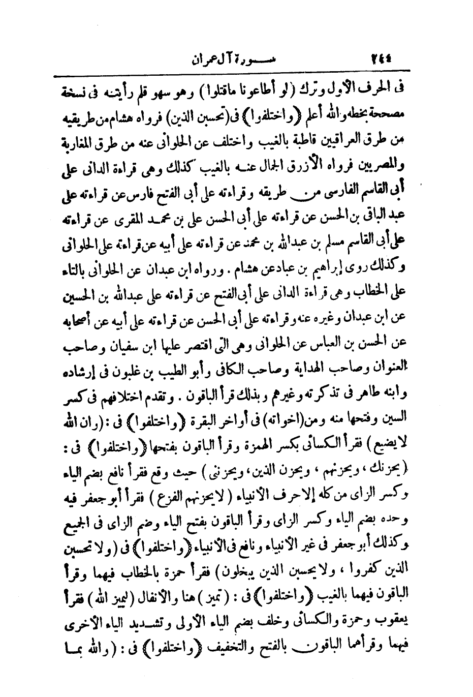 (وَاخْتَلَفُوا) فِي: تَحْسَبَنَّ الَّذِينَ فَرَوَاهُ هِشَامٌ مِنْ طَرِيقَيْهِ مِنْ طَرِيقِ الْعِرَاقِيِّينَ قَاطِبَةً بِالْغَيْبِ، وَاخْتُلِفَ عَنِ الْحُلْوَانِيِّ عَنْهُ مِنْ طُرُقِ الْمَغَارِبَةِ، وَالْمِصْرِيِّينَ فَرَوَاهُ الْأَزْرَقُ الْجَمَّالُ عَنْهُ بِالْغَيْبِ كَذَلِكَ، وَهِيَ قِرَاءَةُ الدَّانِيِّ عَلَى أَبِي الْقَاسِمِ الْفَارِسِيِّ مِنْ طَرِيقِهِ عَلَى أَبِي الْفَتْحِ فَارِسٍ عَنْ قِرَاءَتِهِ عَلَى عَبْدِ الْبَاقِي بْنِ الْحَسَنِ عَنْ قِرَاءَتِهِ عَلَى أَبِي الْحَسَنِ عَلِيِّ بْنِ مُحَمَّدٍ الْمُقْرِئِ عَنْ قِرَاءَتِهِ عَلَى أَبِي الْقَاسِمِ مُسْلِمِ بْنِ عَبْدِ اللَّهِ بْنِ مُحَمَّدٍ عَنْ قِرَاءَتِهِ عَلَى أَبِيهِ عَنْ قِرَاءَتِهِ عَلَى الْحُلْوَانِيِّ، وَكَذَلِكَ رَوَى إِبْرَاهِيمُ بْنُ عَبَّادٍ عَنْ هِشَامٍ. وَرَوَاهُ ابْنُ عَبْدَانَ عَنِ الْحُلْوَانِيِّ بِالتَّاءِ عَلَى الْخِطَابِ، وَهِيَ قِرَاءَةُ الدَّانِيِّ عَلَى أَبِي الْفَتْحِ عَنْ قِرَاءَتِهِ عَلَى عَبْدِ اللَّهِ بْنِ الْحُسَيْنِ عَنِ ابْنِ عَبْدَانَ، وَغَيْرِهِ عَنْهُ، وَقَرَأْتُهُ عَلَى أَبِي الْحَسَنِ عَنْ قِرَاءَتِهِ عَلَى أَبِيهِ عَنْ أَصْحَابِهِ عَنِ الْحَسَنِ بْنِ الْعَبَّاسِ عَنِ الْحُلْوَانِيِّ، وَهِيَ الَّتِي اقْتَصَرَ عَلَيْهَا ابْنُ سُفْيَانَ، وَصَاحِبُ الْعُنْوَانِ، وَصَاحِبُ الْهِدَايَةِ، وَصَاحِبُ الْكَافِي أَبُو الطَّيِّبِ بْنُ غَلْبُونَ فِي إِرْشَادِهِ، وَابْنُهُ طَاهِرٌ فِي تَذْكِرَتِهِ، وَغَيْرُهُمْ، وَبِذَلِكَ قَرَأَ الْبَاقُونَ. وَتَقَدَّمَ اخْتِلَافُهُمْ فِي كَسْرِ السِّينِ وَفَتْحِهَا مِنْهُ، وَمِنْ أَخَوَاتِهِ فِي أَوَاخِرِ الْبَقَرَةِ.