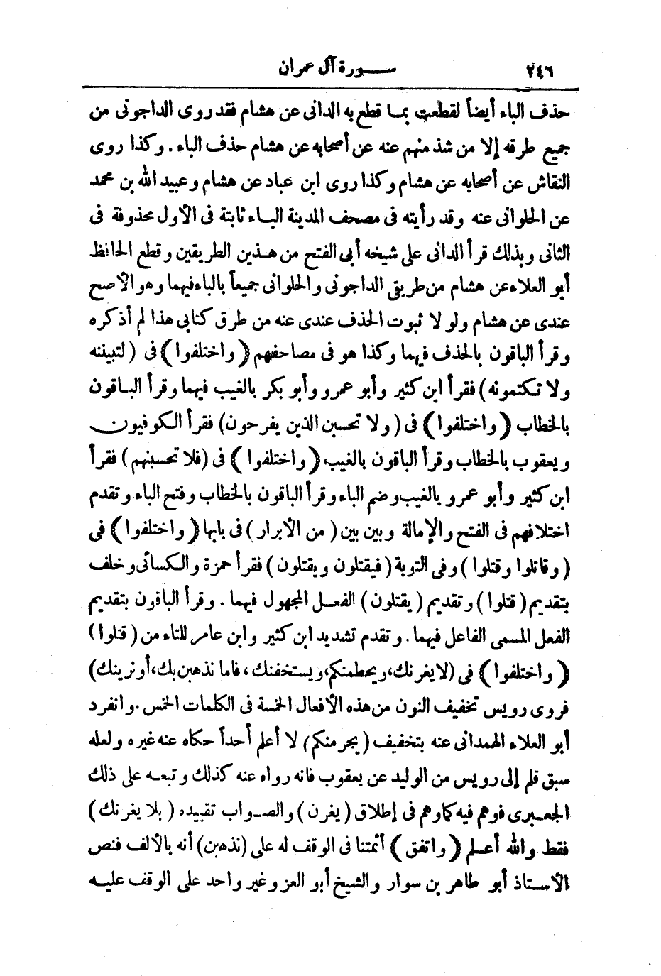 حَذْفَ الْبَاءِ أَيْضًا لَقَطَعْتُ بِمَا قَطَعَ بِهِ الدَّانِيُّ عَنْ هِشَامٍ، فَقَدْ رَوَى الدَّاجُونِيُّ مِنْ جَمِيعِ طُرُقِهِ إِلَّا مَنْ شَذَّ مِنْهُمْ عَنْهُ عَنْ أَصْحَابِهِ عَنْ هِشَامٍ حَذْفَ الْبَاءِ. وَكَذَا رَوَى النَّقَّاشُ عَنْ أَصْحَابِهِ عَنْ هِشَامٍ، وَكَذَا رَوَى ابْنُ عَبَّادٍ عَنْ هِشَامٍ وَعُبَيْدُ اللَّهِ بْنُ مُحَمَّدٍ عَنِ الْحُلْوَانِيِّ عَنْهُ، وَقَدْ رَأَيْتُهُ فِي مُصْحَفِ الْمَدِينَةِ: الْبَاءُ ثَابِتَةٌ فِي الْأَوَّلِ مَحْذُوفَةٌ فِي الثَّانِي، وَبِذَلِكَ قَرَأَ الدَّانِيُّ عَلَى شَيْخِهِ أَبِي الْفَتْحِ مِنْ هَذَيْنِ الطَّرِيقَيْنِ، وَقَطَعَ الْحَافِظُ أَبُو الْعَلَاءِ عَنْ هِشَامٍ مِنْ طَرِيقَيِ الدَّاجُونِيِّ وَالْحُلْوَانِيِّ جَمِيعًا بِالْبَاءِ فِيهِمَا، وَهُوَ الْأَصَحُّ عِنْدِي عَنْ هِشَامٍ وَلَوْلَا ثُبُوتُ الْحَذْفِ عِنْدِي عَنْهُ مِنْ طُرُقِ كِتَابِي هَذَا لَمْ أَذْكُرْهُ، وَقَرَأَ الْبَاقُونَ بِالْحَذْفِ فِيهِمَا، وَكَذَا هُوَ فِي مَصَاحِفِهِمْ.
