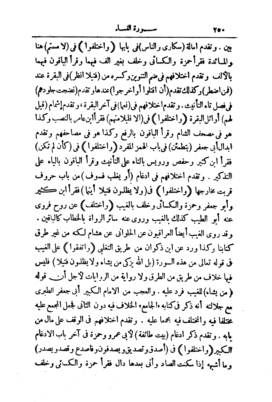 وَالْعَجَبُ مِنَ الْإِمَامِ الْكَبِيرِ أَبِي جَعْفَرٍ الطَّبَرِيِّ مَعَ جَلَالَتِهِ أَنَّهُ ذَكَرَ فِي كِتَابِهِ الْجَامِعِ الْخِلَافَ فِيهِ دُونَ الثَّانِي فَجَعَلَ الْمُجْمَعَ عَلَيْهِ مُخْتَلَفًا فِيهِ وَالْمُخْتَلَفَ فِيهِ مُجْمَعًا عَلَيْهِ، وَتَقَدَّمَ اخْتِلَافُهُمْ فِي الْوَقْفِ عَلَى مَالٍ مِنْ بَابِهِ، وَتَقَدَّمَ ذِكْرُ إِدْغَامِ بَيَّتَ طَائِفَةٌ لِأَبِي عَمْرٍو وَحَمْزَةَ فِي آخِرِ بَابِ الْإِدْغَامِ الْكَبِيرِ