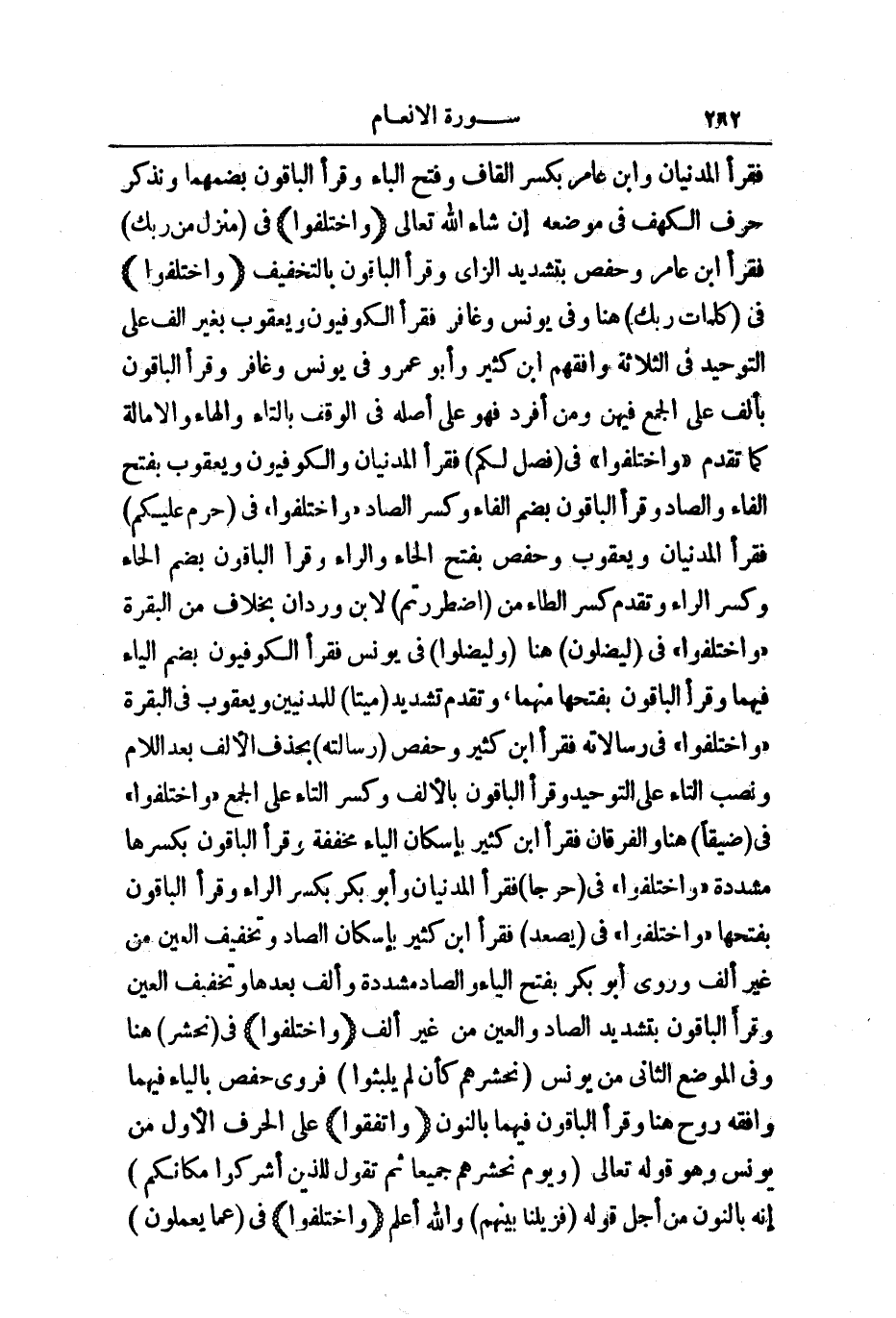 (وَاخْتَلَفُوا) فِي: فَصَّلَ لَكُمْ فَقَرَأَ الْمَدَنِيَّانِ، وَالْكُوفِيُّونَ وَيَعْقُوبُ بِفَتْحِ الْفَاءِ وَالصَّادِ، وَقَرَأَ الْبَاقُونَ بِضَمِّ الْفَاءِ وَكَسْرِ الصَّادِ (وَاخْتَلَفُوا) فِي: حَرَّمَ عَلَيْكُمُ فَقَرَأَ الْمَدَنِيَّانِ وَيَعْقُوبُ وَحَفْصٌ بِفَتْحِ الْحَاءِ وَالرَّاءِ، وَقَرَأَ الْبَاقُونَ بِضَمِّ الْحَاءِ وَكَسْرِ الرَّاءِ، وَتَقَدَّمَ كَسْرُ الطَّاءِ مِنِ اضْطُرِرْتُمْ لِابْنِ وَرْدَانَ بِخِلَافٍ مِنَ الْبَقَرَةِ.