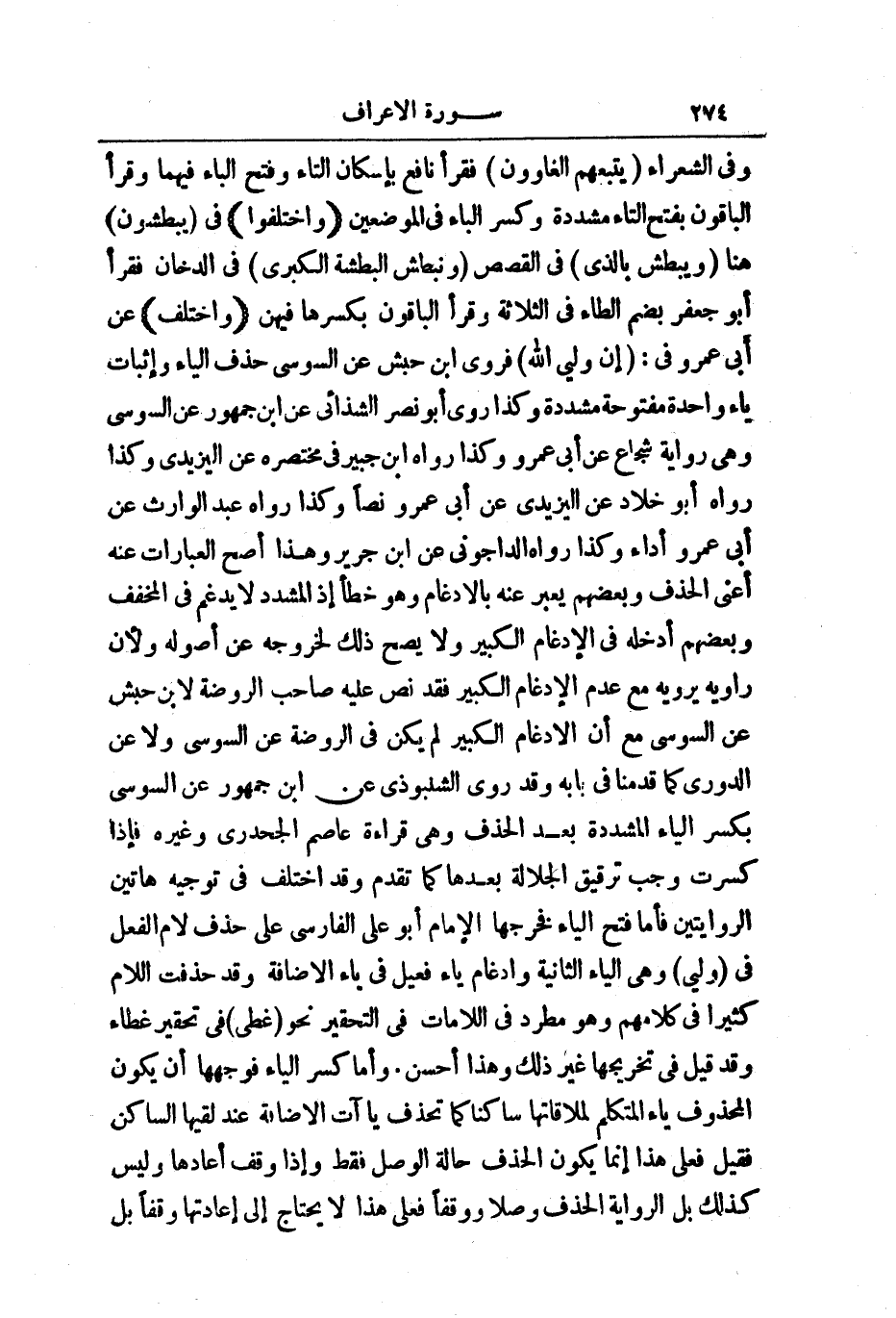 (وَاخْتَلَفَ) عَنْ أَبِي عَمْرٍو فِي: إِنَّ وَلِيِّيَ اللَّهُ، فَرَوَى ابْنُ حَبَشٍ عَنِ السُّوسِيِّ حَذْفَ الْيَاءِ وَإِثْبَاتَ يَاءٍ وَاحِدَةٍ مَفْتُوحَةٍ مُشَدَّدَةٍ، وَكَذَا رَوَى أَبُو نَصْرٍ الشَّذَائِيُّ عَنِ ابْنِ جُمْهُورٍ عَنِ السُّوسِيِّ، وَهِيَ رِوَايَةُ شُجَاعٍ عَنْ أَبِي عَمْرٍو، وَكَذَا رَوَاهُ ابْنُ جُبَيْرٍ فِي مُخْتَصَرِهِ عَنِ الْيَزِيدِيِّ، وَكَذَا رَوَاهُ أَبُو خَلَّادٍ عَنِ الْيَزِيدِيِّ عَنْ أَبِي عَمْرٍو نَصًّا، وَكَذَا رَوَاهُ عَبْدُ الْوَارِثِ عَنْ أَبِي عَمْرٍو أَدَاءً، وَكَذَا رَوَاهُ الدَّاجُونِيُّ عَنِ ابْنِ جَرِيرٍ، وَهَذَا أَصَحُّ الْعِبَارَاتِ عَنْهُ، أَعْنِي الْحَذْفَ، وَبَعْضُهُمْ يُعَبِّرُ عَنْهُ بِالْإِدْغَامِ، وَهُوَ خَطَأٌ إِذِ الْمُشَدَّدُ لَا يُدْغَمُ فِي الْمُخَفَّفِ، وَبَعْضُهُمْ أَدْخَلَهُ فِي الْإِدْغَامِ الْكَبِيرِ، وَلَا يَصِحُّ ذَلِكَ لِخُرُوجِهِ عَنْ أُصُولِهِ، وَلِأَنَّ رَاوِيَهُ يَرْوِيهِ مَعَ عَدَمِ الْإِدْغَامِ الْكَبِيرِ، فَقَدْ نَصَّ عَلَيْهِ صَاحِبُ الرَّوْضَةِ لِابْنِ حَبَشٍ عَنِ السُّوسِيِّ مَعَ أَنَّ الْإِدْغَامَ الْكَبِيرَ لَمْ يَكُنْ فِي الرَّوْضَةِ عَنِ السُّوسِيِّ، وَلَا عَنِ الدُّورِيِّ كَمَا قَدَّمْنَا فِي بَابِهِ، رَوَى الشَّنَبُوذِيُّ عَنِ ابْنِ جُمْهُورٍ عَنِ السُّوسِيِّ بِكَسْرِ الْيَاءِ الْمُشَدَّدَةِ بَعْدَ الْحَذْفِ، وَهِيَ قِرَاءَةُ عَاصِمٍ الْجَحْدَرَيِّ، وَغَيْرِهِ فَإِذَا كُسِرَتْ وَجَبَ تَرْقِيقُ الْجَلَالَةِ بَعْدَهَا كَمَا تَقَدَّمَ، وَقَدِ اخْتُلِفَ فِي تَوْجِيهِ هَاتَيْنِ الرِّوَايَتَيْنِ، فَأَمَّا فَتْحُ الْيَاءِ فَخَرَّجَهَا الْإِمَامُ أَبُو عَلِيٍّ الْفَارِسِيُّ عَلَى حَذْفِ لَامِ الْفِعْلِ فِي وَلِيٍّ، وَهِيَ الْيَاءُ الثَّانِيَةُ وَإِدْغَامِ يَاءِ فَعِيلٍ فِي يَاءِ الْإِضَافَةِ، وَقَدْ حُذِفَتِ اللَّامُ فِي كَلَامِهِمْ كَثِيرًا، وَهُوَ مُطَّرِدٌ فِي اللَّامَاتِ فِي التَّحْقِيرِ نَحْوَ غُطَىٍّ فِي تَحْقِيرِ غِطَاءٍ، وَقَدْ قِيلَ فِي تَخْرِيجِهَا غَيْرُ ذَلِكَ، وَهَذَا أَحْسَنُ.