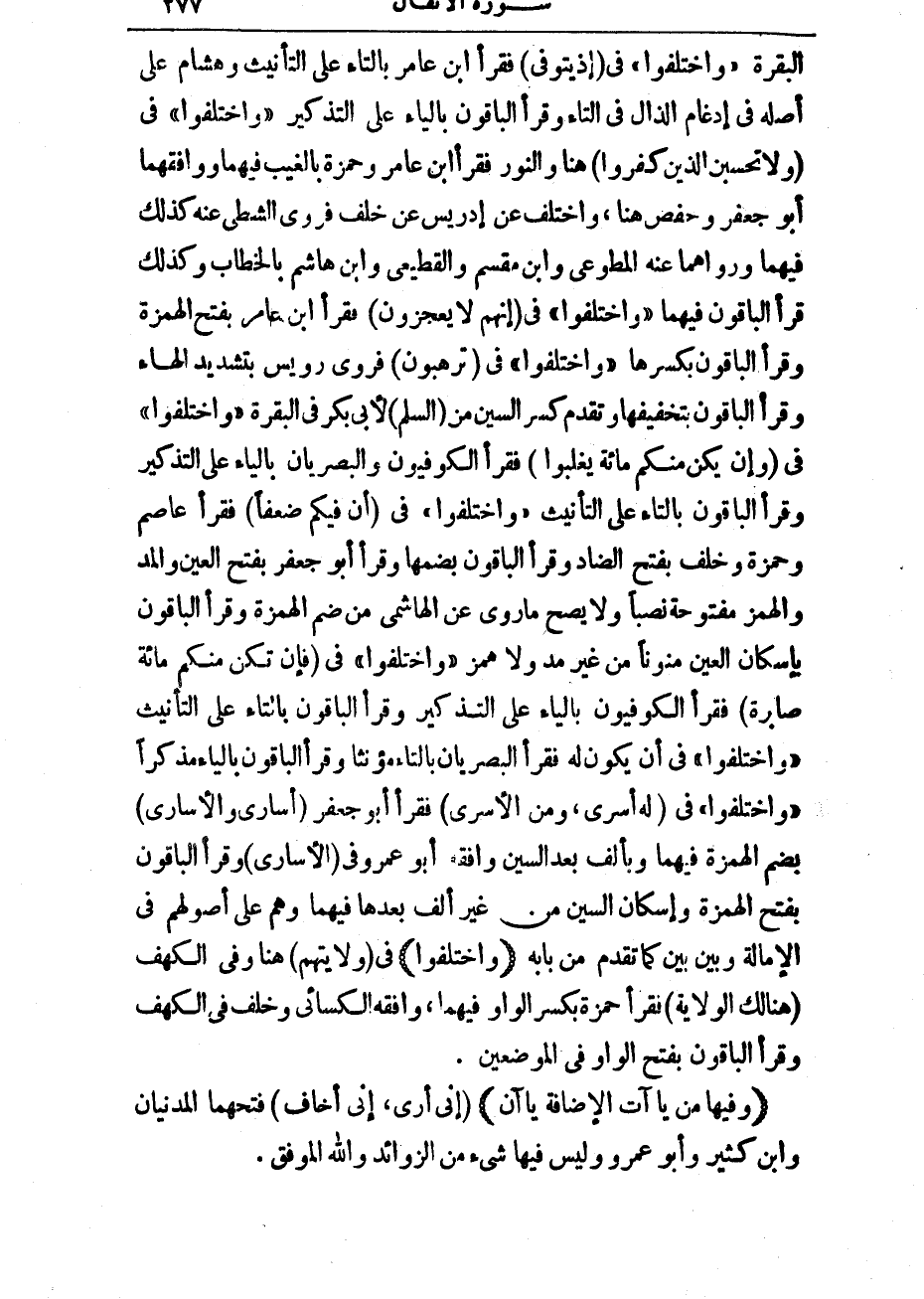 (وَاخْتَلَفُوا) فِي: وَلَا يَحْسَبَنَّ الَّذِينَ كَفَرُوا هُنَا وَالنُّورِ فَقَرَأَ ابْنُ عَامِرٍ وَحَمْزَةُ بِالْغَيْبِ فِيهِمَا، وَوَافَقَهُمَا أَبُو جَعْفَرٍ وَحَفْصٌ هُنَا، وَاخْتُلِفَ عَنْ إِدْرِيسَ عَنْ خَلَفٍ، فَرَوَى الشَّطِّيُّ عَنْهُ كَذَلِكَ فِيهِمَا، وَرَوَاهُمَا عَنْهُ الْمُطَّوِّعِيُّ وَابْنُ مِقْسَمٍ وَالْقَطِيعِيُّ وَابْنُ هَاشِمٍ بِالْخِطَابِ، وَكَذَلِكَ قَرَأَ الْبَاقُونَ فِيهِمَا.
