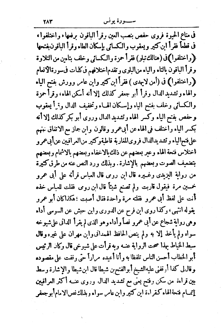 (وَاخْتَلَفُوا) فِي: أَمْ مَنْ لَا يَهِدِّي فَقَرَأَ ابْنُ كَثِيرٍ وَابْنُ عَامِرٍ وَوَرْشٌ بِفَتْحِ الْيَاءِ، وَالْهَاءِ، وَتَشْدِيدِ الدَّالِ، وَقَرَأَ أَبُو جَعْفَرٍ كَذَلِكَ إِلَّا أَنَّهُ أَسْكَنَ الْهَاءَ، وَقَرَأَ حَمْزَةُ وَالْكِسَائِيُّ وَخَلَفٌ بِفَتْحِ الْيَاءِ، وَإِسْكَانِ الْهَاءِ وَتَخْفِيفِ الدَّالِ، وَقَرَأَ يَعْقُوبُ وَحَفْصٌ بِفَتْحِ الْيَاءِ وَكَسْرِ الْهَاءِ وَتَشْدِيدِ الدَّالِ، وَرَوَى أَبُو بَكْرٍ كَذَلِكَ إِلَّا أَنَّهُ بِكَسْرِ الْيَاءِ، وَاخْتُلِفَ فِي الْهَاءِ عَنْ أَبِي عَمْرٍو وَقَالُونَ وَابْنِ جَمَّازٍ مَعَ الِاتِّفَاقِ عَنْهُمْ عَلَى فَتْحِ الْيَاءِ وَتَشْدِيدِ الدَّالِ، فَرَوَى الْمَغَارِبَةُ قَاطِبَةً وَكَثِيرٌ مِنَ الْعِرَاقِيِّينَ عَنْ أَبِي عَمْرٍو اخْتِلَاسَ فَتْحَةِ الْهَاءِ، وَعَبَّرَ بَعْضُهُمْ عَنْ ذَلِكَ بِالْإِخْفَاءِ وَبَعْضُهُمْ بِالْإِشْمَامِ وَبَعْضُهُمْ بِتَضْعِيفِ الصَّوْتِ وَبَعْضُهُمْ بِالْإِشَارَةِ. وَبِذَلِكَ وَرَدَ النَّصُّ عَنْهُ مِنْ طُرُقٍ كَثِيرَةٍ مِنْ رِوَايَةِ الْيَزِيدِيِّ، وَغَيْرِهِ. قَالَ ابْنُ رُومِيٍّ: قَالَ الْعَبَّاسُ: قَرَأْتُهُ عَلَى أَبِي عَمْرٍو خَمْسِينَ مَرَّةً فَيَقُولُ: قَارَبْتَ، وَلَمْ تَصْنَعْ شَيْئًا. قَالَ ابْنُ رُومِيٍّ: فَقُلْتُ لِلْعَبَّاسِ: خُذْهُ أَنْتَ عَلَى لَفْظِ أَبِي عَمْرٍو فَقُلْتُهُ مَرَّةً وَاحِدَةً فَقَالَ: أَصَبْتَ; هَكَذَا كَانَ أَبُو عَمْرٍو يَقُولُهُ انْتَهَى. وَكَذَا رَوَى ابْنُ فَرَحٍ عَنِ الدُّورِيِّ وَابْنُ حَبَشٍ عَنِ السُّوسِيِّ أَدَاءً، وَهِيَ رِوَايَةُ شُجَاعٍ عَنْ أَبِي عَمْرٍو نَصًّا وَأَدَاءً، وَهُوَ الَّذِي لَمْ يَقْرَأِ الدَّانِيُّ عَلَى شُيُوخِهِ سِوَاهُ، وَلَمْ يَأْخُذْ إِلَّا بِهِ، وَلَمْ يَنُصَّ الْحَافِظُ الْهَمْدَانِيُّ وَابْنُ مِهْرَانَ عَلَى غَيْرِهِ، وَقَالَ سِبْطُ الْخَيَّاطِ: بِهَذَا صَحَّتِ الرِّوَايَةُ عَنْهُ، وَبِهِ قَرَأْتُ عَلَى شُيُوخِي قَالَ: وَكَانَ الرَّئِيسُ أَبُو الْخَطَّابِ أَحْسَنَ النَّاسِ تَلَفُّظًا بِهِ وَأَنَا أُعِيدُهُ مِرَارًا حَتَّى وَقَفْتُ عَلَى مَقْصُودِهِ، وَقَالَ لِي: كَذَا أَوْقَفَنِي عَلَيْهِ الشَّيْخُ أَبُو الْفَتْحِ بْنُ شَيْطَا قَالَ ابْنُ شَيْطَا وَالْإِشَارَةُ وَسَطٌ بَيْنَ قِرَاءَةِ مَنْ سَكَّنَ وَفَتَحَ يَعْنِي تَشْدِيدَ الدَّالِ، وَرَوَى عَنْهُ أَكْثَرُ الْعِرَاقِيِّينَ إِتْمَامَ فَتْحَةِ الْهَاءِ كَقِرَاءَةِ ابْنِ كَثِيرٍ وَابْنِ عَامِرٍ سَوَاءً، وَبِذَلِكَ نَصَّ الْإِمَامُ أَبُو جَعْفَرٍ