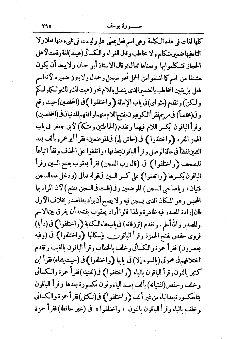 (وَاخْتَلَفُوا) فِي: قَالَ رَبِّ السِّجْنُ فَقَرَأَ يَعْقُوبُ بِفَتْحِ السِّينِ، وَقَرَأَ الْبَاقُونَ بِكَسْرِهَا.