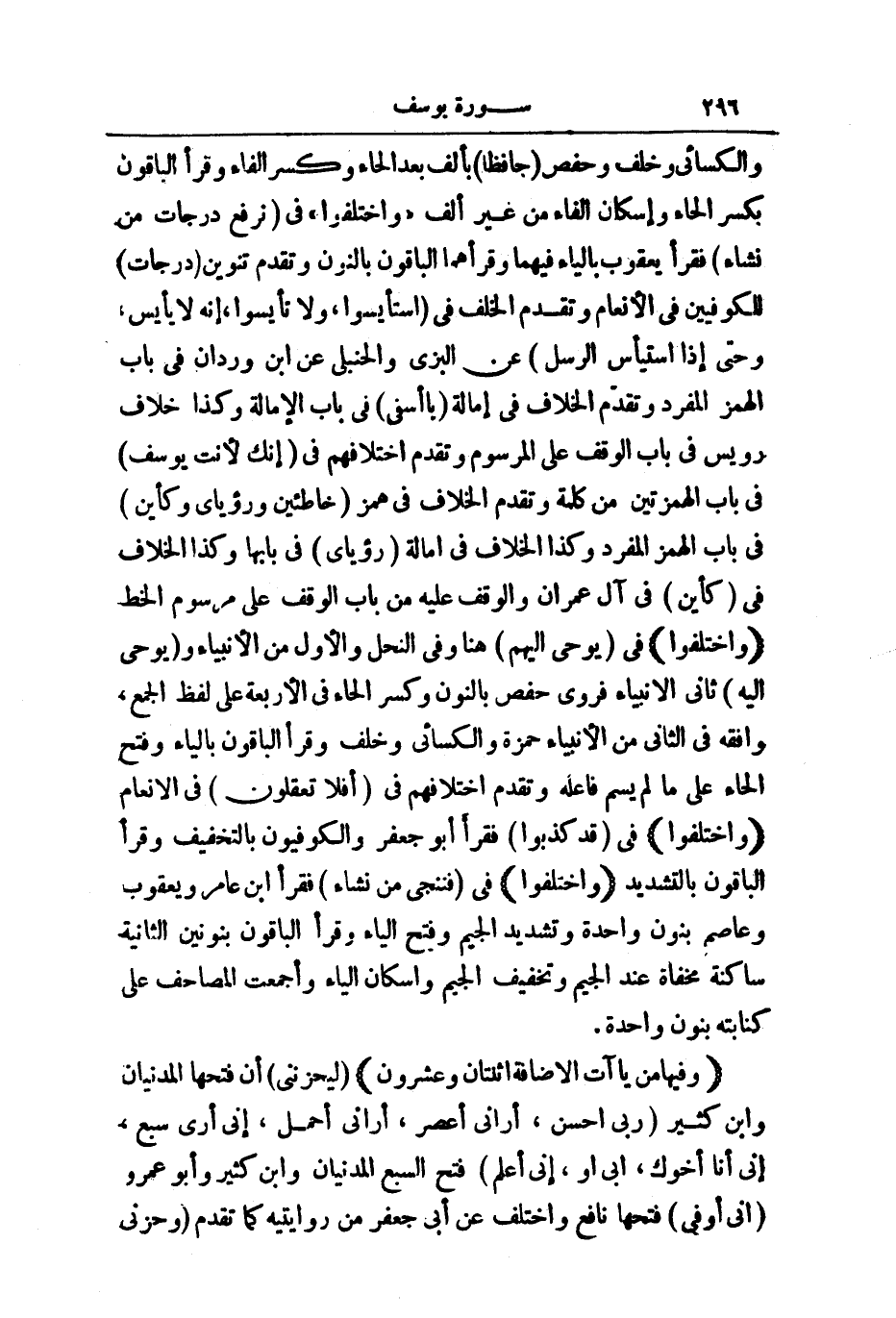 وَتَقَدَّمَ الْخِلَافُ فِي إِمَالَةِ يَاأَسَفَى فِي بَابِ الْإِمَالَةِ، وَكَذَا خِلَافُ رُوَيْسٍ فِي بَابِ الْوَقْفِ عَلَى الْمَرْسُومِ، وَتَقَدَّمَ اخْتِلَافُهُمْ فِي أَئِنَّكَ لَأَنْتَ يُوسُفُ فِي بَابِ الْهَمْزَتَيْنِ مِنْ كَلِمَةٍ، وَتَقَدَّمَ الْخِلَافُ فِي هَمْزِ خَاطِئِينَ وَرُؤْيَايَ وَكَأَيِّنْ فِي بَابِ الْهَمْزِ الْمُفْرَدِ، وَكَذَا الْخِلَافُ فِي إِمَالَةِ رُؤْيَايَ فِي بَابِهَا، وَكَذَا الْخِلَافُ فِي وَكَأَيِّنْ فِي آلِ عِمْرَانَ وَالْوَقْفِ عَلَيْهِ مِنْ بَابِ الْوَقْفِ عَلَى مَرْسُومِ الْخَطِّ.