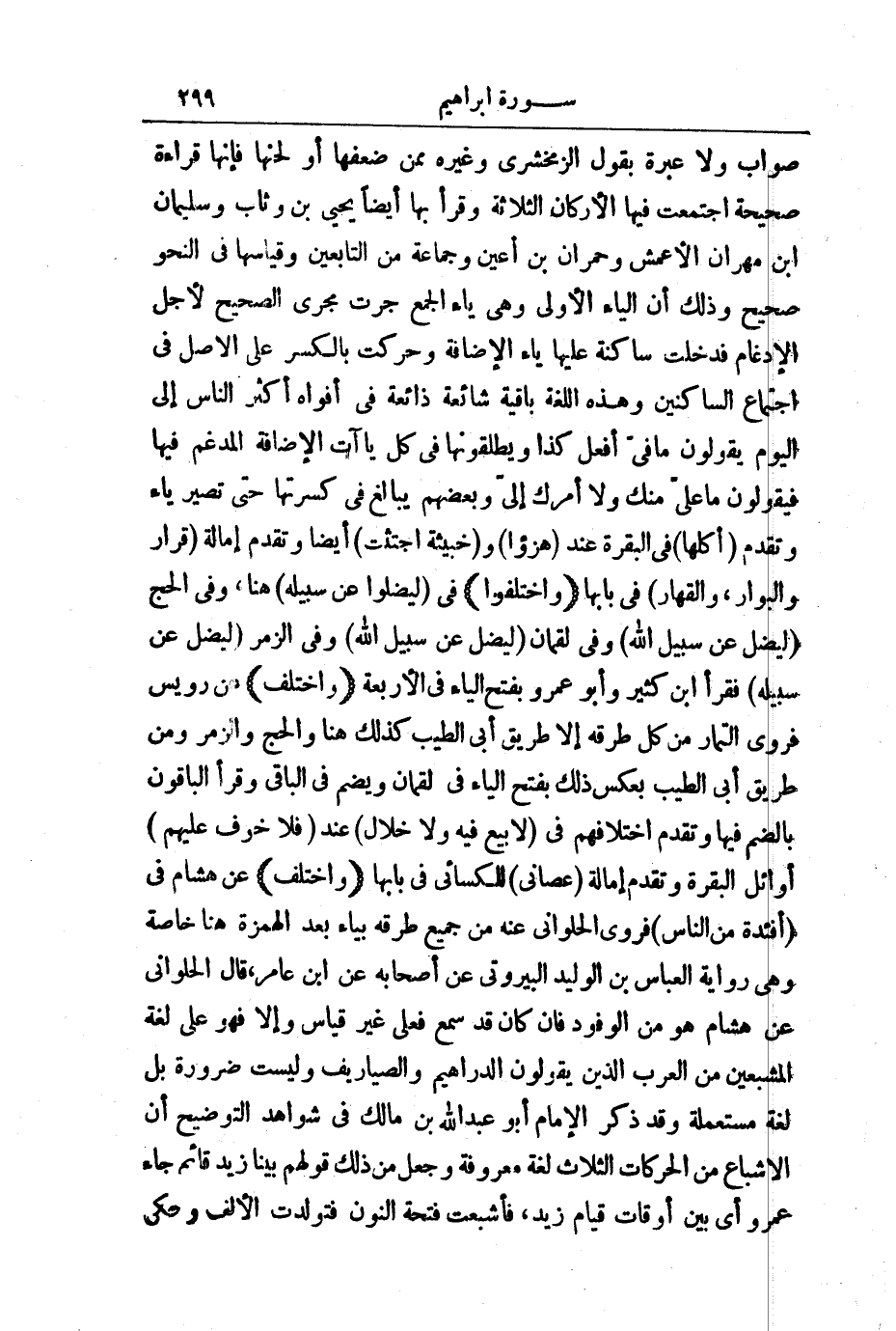 صَوَابٌ، وَلَا عِبْرَةَ بِقَوْلِ الزَّمَخْشَرِيِّ، وَغَيْرِهِ مِمَّنْ ضَعَّفَهَا، أَوْ لَحَّنَهَا فَإِنَّهَا قِرَاءَةٌ صَحِيحَةٌ اجْتَمَعَتْ فِيهَا الْأَرْكَانُ الثَّلَاثَةُ، وَقَرَأَ بِهَا أَيْضًا يَحْيَى بْنُ رِئَابٍ وَسُلَيْمَانُ بْنُ مِهْرَانَ الْأَعْمَشُ وَحُمْرَانُ بْنُ أَعْيَنَ وَجَمَاعَةٌ مِنَ التَّابِعِينَ، وَقِيَاسُهَا فِي النَّحْوِ صَحِيحٌ، وَذَلِكَ أَنَّ الْيَاءَ الْأُولَى، وَهِيَ يَاءُ الْجَمْعِ جَرَتْ مَجْرَى الصَّحِيحِ لِأَجْلِ الْإِدْغَامِ فَدَخَلَتْ سَاكِنَةً عَلَيْهَا يَاءُ الْإِضَافَةِ وَحُرِّكَتْ بِالْكَسْرِ عَلَى الْأَصْلِ فِي اجْتِمَاعِ السَّاكِنَيْنِ وَهَذِهِ اللُّغَةُ بَاقِيَةٌ شَائِعَةٌ ذَائِعَةٌ فِي أَفْوَاهِ أَكْثَرِ النَّاسِ إِلَى الْيَوْمِ، يَقُولُونَ مَا فِيِّ كَذَا، يُطْلِقُونَهَا فِي كُلِّ يَاءَاتِ الْإِضَافَةِ الْمُدْغَمِ فِيهَا، فَيَقُولُونَ مَا عَلَيِّ مِنْكَ، وَلَا أَمْرُكَ إِلَيِّ، بَعْضُهُمْ يُبَالِغُ فِي كَسْرَتِهَا حَتَّى تَصِيرَ يَاءً، وَتَقَدَّمَ أُكُلَهَا فِي الْبَقَرَةِ عِنْدَ هُزُوًا وَخَبِيثَةٍ اجْتُثَّتْ أَيْضًا وَتَقَدَّمَ إِمَالَةُ قَرَارٍ وَالْبَوَارِ وَالْقَهَّارُ فِي بَابِهَا.