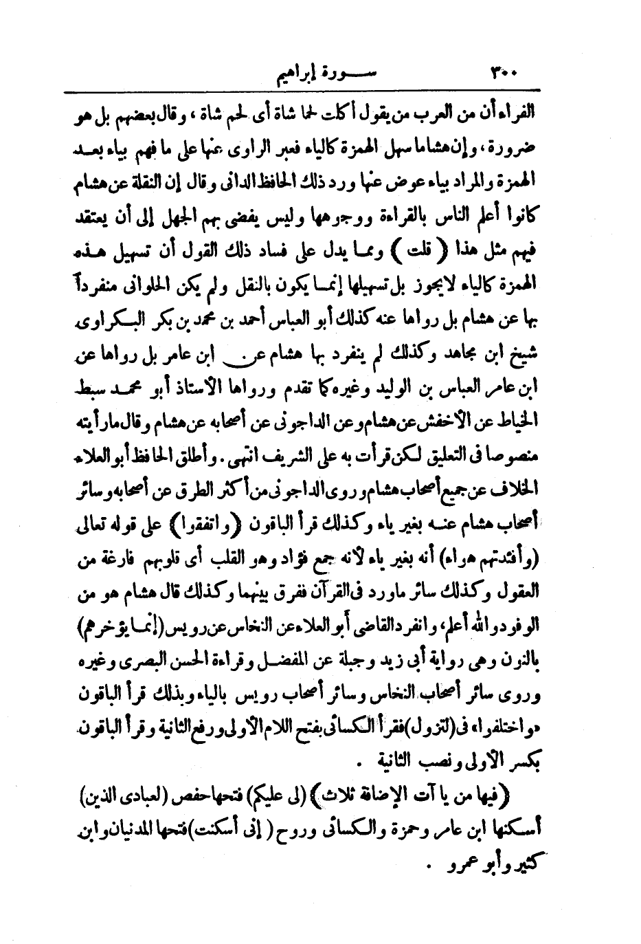 (قُلْتُ) : وَمِمَّا يَدُلُّ عَلَى فَسَادِ ذَلِكَ الْقَوْلِ أَنَّ تَسْهِيلَ هَذِهِ الْهَمْزَةِ كَالْيَاءِ لَا يَجُوزُ، بَلْ تَسْهِيلُهَا إِنَّمَا يَكُونُ بِالنَّقْلِ، وَلَمْ يَكُنِ الْحُلْوَانِيُّ مُنْفَرِدًا بِهَا عَنْ هِشَامٍ، بَلْ رَوَاهَا عَنْهُ كَذَلِكَ أَبُو الْعَبَّاسِ أَحْمَدُ بْنُ مُحَمَّدِ بْنِ بَكْرٍ الْبَكْرَاوِيُّ شَيْخُ ابْنِ مُجَاهِدٍ، وَكَذَلِكَ لَمْ يَنْفَرِدْ بِهَا هِشَامٌ عَنِ ابْنِ عَامِرٍ، بَلْ رَوَاهَا عَنِ ابْنِ عَامِرٍ الْعَبَّاسُ بْنُ الْوَلِيدِ، وَغَيْرُهُ كَمَا تَقَدَّمَ، وَرَوَاهَا الْأُسْتَاذُ أَبُو مُحَمَّدٍ سِبْطُ الْخَيَّاطِ عَنِ الْأَخْفَشِ عَنْ هِشَامٍ، وَعَنِ الدَّاجُونِيِّ عَنْ أَصْحَابِهِ عَنْ هِشَامٍ، وَقَالَ: مَا رَأَيْتُهُ مَنْصُوصًا فِي التَّعْلِيقِ لَكِنْ قَرَأْتُ بِهِ عَلَى الشَّرِيفِ، انْتَهَى. وَأَطْلَقَ الْحَافِظُ أَبُو الْعَلَاءِ الْخِلَافَ عَنْ جَمِيعِ أَصْحَابِ هِشَامٍ، وَرَوَى الدَّاجُونِيُّ مِنْ أَكْثَرِ الطُّرُقِ عَنْ أَصْحَابِهِ وَسَائِرِ أَصْحَابِ هِشَامٍ عَنْهُ بِغَيْرِ يَاءٍ، وَكَذَلِكَ قَرَأَ الْبَاقُونَ.