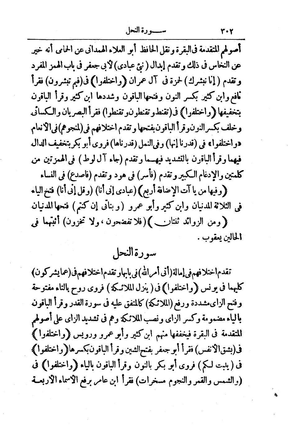 أُصُولِهِمُ الْمُتَقَدِّمَةِ فِي الْبَقَرَةِ، وَنَقَلَ الْحَافِظُ أَبُو الْعَلَاءِ الْهَمْدَانِيُّ عَنِ الْحَمَّامِيِّ أَنَّهُ خُيِّرَ عَنِ النَّخَّاسِ فِي ذَلِكَ، وَتَقَدَّمَ إِبْدَالُ نَبِّئْ عِبَادِي لِأَبِي جَعْفَرٍ فِي بَابِ الْهَمْزِ الْمُفْرَدِ، وَتَقَدَّمَ إِنَّا نُبَشِّرُكَ لِحَمْزَةَ فِي آلِ عِمْرَانَ.
