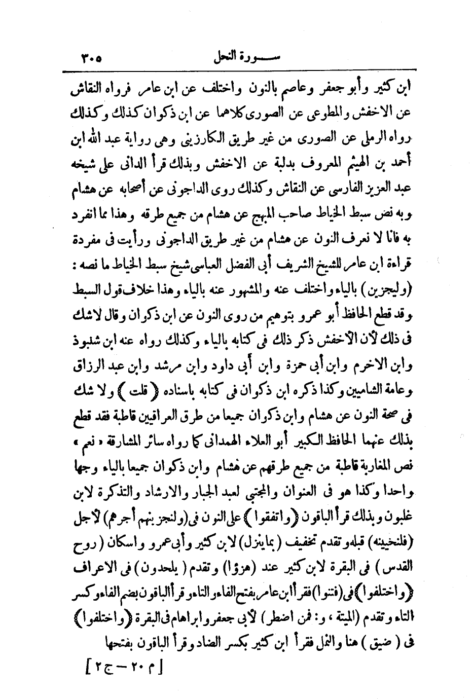 ابْنُ كَثِيرٍ وَأَبُو جَعْفَرٍ وَعَاصِمٌ بِالنُّونِ، وَاخْتُلِفَ عَنِ ابْنِ عَامِرٍ فَرَوَاهُ النَّقَّاشُ عَنِ الْأَخْفَشِ وَالْمُطَّوِّعِيُّ عَنِ الصُّورِيِّ كِلَاهُمَا عَنِ ابْنِ ذَكْوَانَ كَذَلِكَ، وَكَذَلِكَ رَوَاهُ الرَّمْلِيُّ عَنِ الصُّورِيِّ مِنْ غَيْرِ طَرِيقِ الْكَارَزِينِيِّ، وَهِيَ رِوَايَةُ عَبْدِ اللَّهِ بْنِ أَحْمَدَ بْنِ الْهَيْثَمِ الْمَعْرُوفِ بِدُلْبَةَ عَنِ الْأَخْفَشِ، وَبِذَلِكَ قَرَأَ الدَّانِيُّ عَلَى شَيْخِهِ عَبْدِ الْعَزِيزِ الْفَارِسِيِّ عَنِ النَّقَّاشِ، وَكَذَلِكَ رَوَى الدَّاجُونِيُّ عَنْ أَصْحَابِهِ عَنْ هِشَامٍ، وَبِهِ نَصَّ سِبْطُ الْخَيَّاطِ صَاحِبُ الْمُبْهِجِ عَنْ هِشَامٍ مِنْ جَمِيعِ طُرُقِهِ، وَهَذَا مِمَّا انْفَرَدَ بِهِ، فَإِنَّا لَا نَعْرِفُ النُّونَ عَنْ هِشَامٍ مِنْ غَيْرِ طَرِيقِ الدَّاجُونِيِّ وَرَأَيْتُ فِي مُفْرَدِهِ قِرَاءَةَ ابْنِ عَامِرٍ لِلشَّيْخِ الشَّرِيفِ أَبِي الْفَضْلِ الْعَبَّاسِيِّ شَيْخِ سِبْطِ الْخَيَّاطِ مَا نَصُّهُ: