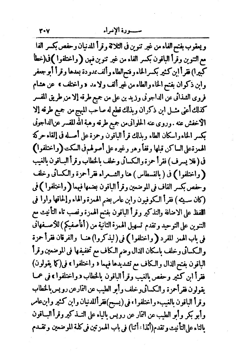 (وَاخْتَلَفُوا) فِي: خِطْئًا كَبِيرًا فَقَرَأَ ابْنُ كَثِيرٍ بِكَسْرِ الْخَاءِ وَفَتْحِ الطَّاءِ وَأَلِفٍ مَمْدُودَةٍ بَعْدَهَا، وَقَرَأَ أَبُو جَعْفَرٍ، وَابْنُ ذَكْوَانَ بِفَتْحِ الْخَاءِ وَالطَّاءِ مِنْ غَيْرِ أَلِفٍ، وَلَا مَدٍّ.