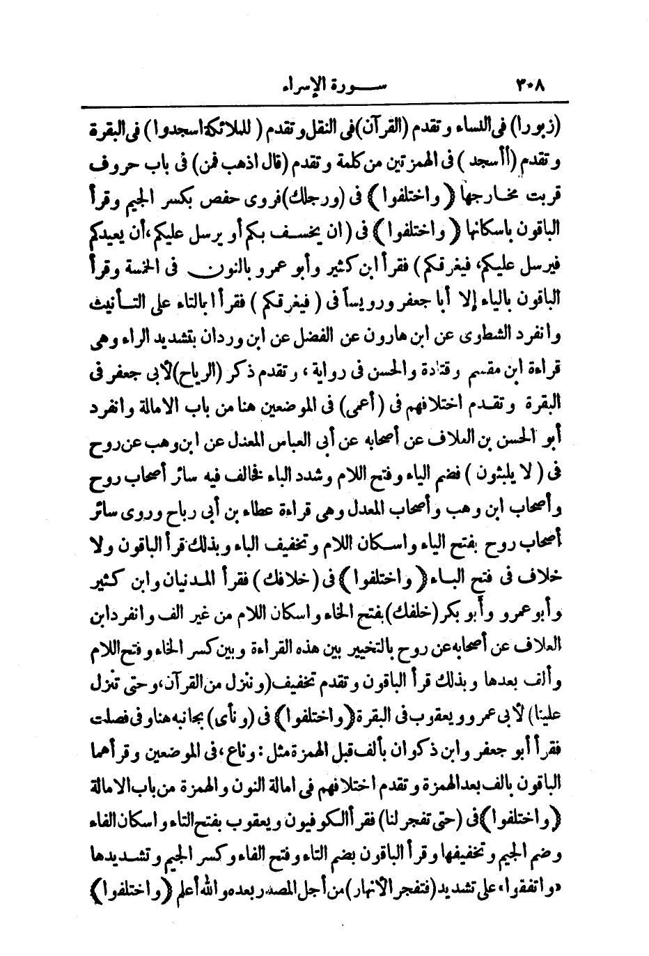 (وَاخْتَلَفُوا) فِي: أَنْ يَخْسِفَ بِكُمْ أَوْ يُرْسِلَ عَلَيْكُمْ أَنْ يُعِيدَكُمْ فَيُرْسِلَ عَلَيْكُمْ فَيُغْرِقَكُمْ فَقَرَأَ ابْنُ كَثِيرٍ وَأَبُو عَمْرٍو بِالنُّونِ فِي الْخَمْسَةِ، وَقَرَأَ الْبَاقُونَ بِالْيَاءِ إِلَّا أَبَا جَعْفَرٍ وَرُوَيْسًا فِي فَيُغْرِقَكُمْ فَقَرَأَ بِالتَّاءِ عَلَى التَّأْنِيثِ، وَانْفَرَدَ الشَّطَوِيُّ عَنِ ابْنِ هَارُونَ عَنِ الْفَضْلِ عَنِ ابْنِ وَرْدَانَ بِتَشْدِيدِ الرَّاءِ، وَهِيَ قِرَاءَةُ ابْنِ مِقْسَمٍ وَقَتَادَةَ وَالْحَسَنِ فِي رِوَايَةٍ، وَتَقَدَّمَ ذِكْرُ الرِّيَاحِ لِأَبِي جَعْفَرٍ فِي الْبَقَرَةِ، وَتَقَدَّمَ اخْتِلَافُهُمْ فِي أَعْمَى فِي الْمَوْضِعَيْنِ هُنَا مِنْ بَابِ الْإِمَالَةِ، وَانْفَرَدَ أَبُو الْحَسَنِ بْنُ الْعَلَّافِ عَنْ أَصْحَابِهِ عَنْ أَبِي الْعَبَّاسِ الْمُعَدَّلِ عَنِ ابْنِ وَهْبٍ عَنْ رَوْحٍ فِي لَا يَلْبَثُونَ فَضَمَّ الْيَاءَ وَفَتَحَ اللَّامَ وَشَدَّدَ الْبَاءَ فَخَالَفَ فِيهِ سَائِرَ أَصْحَابِ رَوْحٍ وَأَصْحَابِ ابْنِ وَهْبٍ وَأَصْحَابِ الْمُعَدَّلِ، وَهِيَ قِرَاءَةُ عَطَاءِ بْنِ أَبِي رَبَاحٍ، وَرَوَى سَائِرُ أَصْحَابِ رَوْحٍ بِفَتْحِ الْيَاءِ، وَإِسْكَانِ اللَّامِ وَتَخْفِيفِ الْيَاءِ، وَبِذَلِكَ قَرَأَ الْبَاقُونَ، وَلَا خِلَافَ فِي فَتْحِ الْيَاءِ.