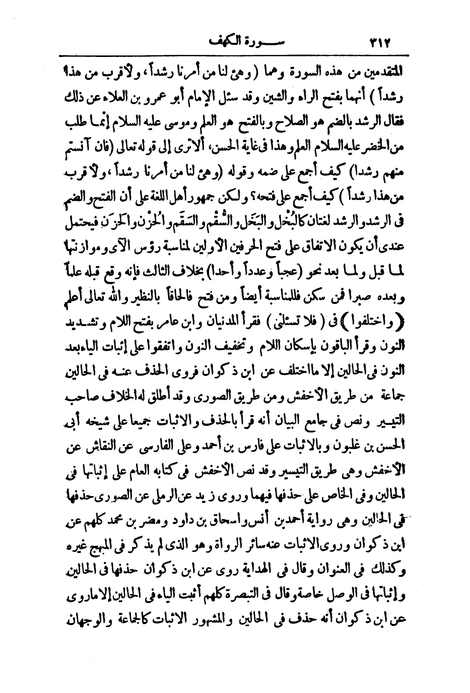الْمُتَقَدِّمَيْنِ مِنْ هَذِهِ السُّورَةِ، وَهُمَا وَهَيِّئْ لَنَا مِنْ أَمْرِنَا رَشَدًا، وَلِأَقْرَبَ مِنْ هَذَا رَشَدًا أَنَّهُمَا بِفَتْحِ الرَّاءِ وَالشِّينِ، وَقَدْ سُئِلَ الْإِمَامُ أَبُو عَمْرِو بْنُ الْعَلَاءِ عَنْ ذَلِكَ فَقَالَ: الرُّشْدُ بِالضَّمِّ هُوَ الصَّلَاحُ وَبِالْفَتْحِ هُوَ الْعِلْمُ، وَمُوسَى عَلَيْهِ السَّلَامُ إِنَّمَا طَلَبَ مِنَ الْخَضِرِ عَلَيْهِ السَّلَامُ الْعِلْمَ، وَهَذَا فِي غَايَةِ الْحُسْنِ، أَلَا تَرَى إِلَى قَوْلِهِ تَعَالَى: فَإِنْ آنَسْتُمْ مِنْهُمْ رُشْدًا كَيْفَ أُجْمِعَ عَلَى فَتْحِهِ؟ وَلَكِنَّ جُمْهُورَ أَهْلِ اللُّغَةِ عَلَى أَنَّ الْفَتْحَ وَالضَّمَّ فِي الرُّشْدِ وَالرَّشَدِ لُغَتَانِ كَالْبُخْلِ وَالْبَخَلِ وَالسُّقْمِ وَالسَّقَمِ وَالْحُزْنِ وَالْحَزَنِ فَيَحْتَمِلُ عِنْدِي أَنْ يَكُونَ الِاتِّفَاقُ عَلَى فَتْحِ الْحَرْفَيْنِ الْأَوَّلِينَ لِمُنَاسِبَةِ رُءُوسِ الْآيِ وَمُوَازَنَتِهَا لِمَا قَبْلُ، وَلِمَا بَعْدُ نَحْوَ عَجَبًا وَعَدَدًا وَأَحَدًا بِخِلَافِ الثَّالِثِ فَإِنَّهُ وَقَعَ قَبْلَهُ عِلْمًا، وَبَعْدَهُ صَبْرًا فَمَنْ سَكَّنَ فَلِلْمُنَاسِبَةِ أَيْضًا، وَمَنْ فَتَحَ فَإِلْحَاقًا بِالنَّظِيرِ وَاللَّهُ تَعَالَى أَعْلَمُ.
