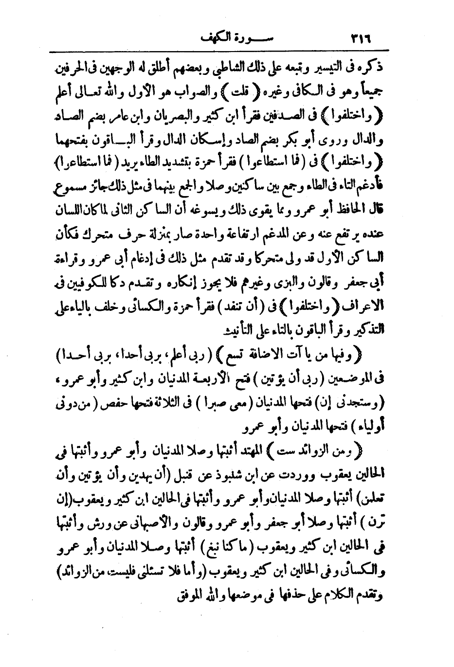(وَفِيهَا مِنْ يَاءَاتِ الْإِضَافَةِ تِسْعٌ) رَبِّي أَعْلَمُ، بِرَبِّي أَحَدًا، بِرَبِّي أَحَدًا فِي الْمَوْضِعَيْنِ رَبِّي أَنْ يُؤْتِيَنِ فَتَحَ الْأَرْبَعَةَ الْمَدَنِيَّانِ، وَابْنُ كَثِيرٍ وَأَبُو عَمْرٍو، وَسَتَجِدُنِي إِنْ فَتَحَهَا الْمَدَنِيَّانِ مَعِيَ صَبْرًا فِي الثَّلَاثَةِ فَتَحَهَا حَفْصٌ مِنْ دُونِي، أَوْلِيَاءَ فَتَحَهَا الْمَدَنِيَّانِ، وَأَبُو عَمْرٍو.