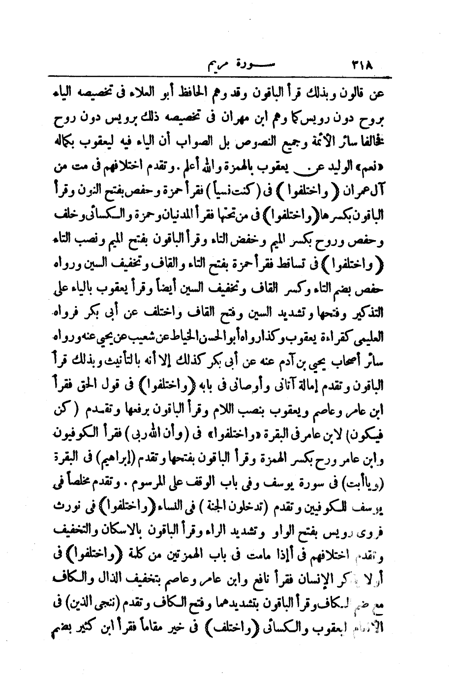 عَنْ قَالُونَ، وَبِذَلِكَ قَرَأَ الْبَاقُونَ، وَقَدْ وَهِمَ الْحَافِظُ أَبُو الْعَلَاءِ فِي تَخْصِيصِهِ الْيَاءَ بِرَوْحٍ دُونَ رُوَيْسٍ كَمَا وَهِمَ ابْنُ مِهْرَانَ فِي تَخْصِيصِهِ ذَلِكَ بِرُوَيْسٍ دُونَ رَوْحٍ فَخَالَفَا سَائِرَ الْأَئِمَّةِ وَجَمِيعَ النُّصُوصِ، بَلِ الصَّوَابُ أَنَّ الْيَاءَ فِيهِ لِيَعْقُوبَ بِكَمَالِهِ. نَعَمِ الْوَلِيدُ عَنْ يَعْقُوبَ بِالْهَمْزَةِ - وَاللَّهُ أَعْلَمُ -.