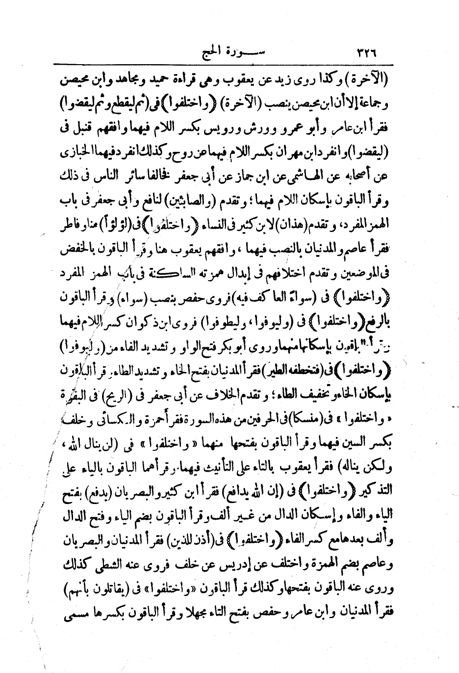 (وَاخْتَلَفُوا) فِي: سَوَاءً الْعَاكِفُ فِيهِ، فَرَوَى حَفْصٌ بِنَصْبِ سَوَاءً، وَقَرَأَ الْبَاقُونَ بِالرَّفْعِ فِي (لِيُوَفُّوا) وَ (لِيَطَّوَفُوا) ، فَرَوَى ابْنُ ذَكْوَانَ كَسْرَ اللَّامِ فِيهِمَا، وَقَرَأَ الْبَاقُونَ بِإِسْكَانِهَا مِنْهُمَا، وَرَوَى أَبُو بَكْرٍ فَتْحَ الْوَاوِ وَتَشْدِيدَ الْفَاءِ مِنْ (وَلْيُوفُوا) .
