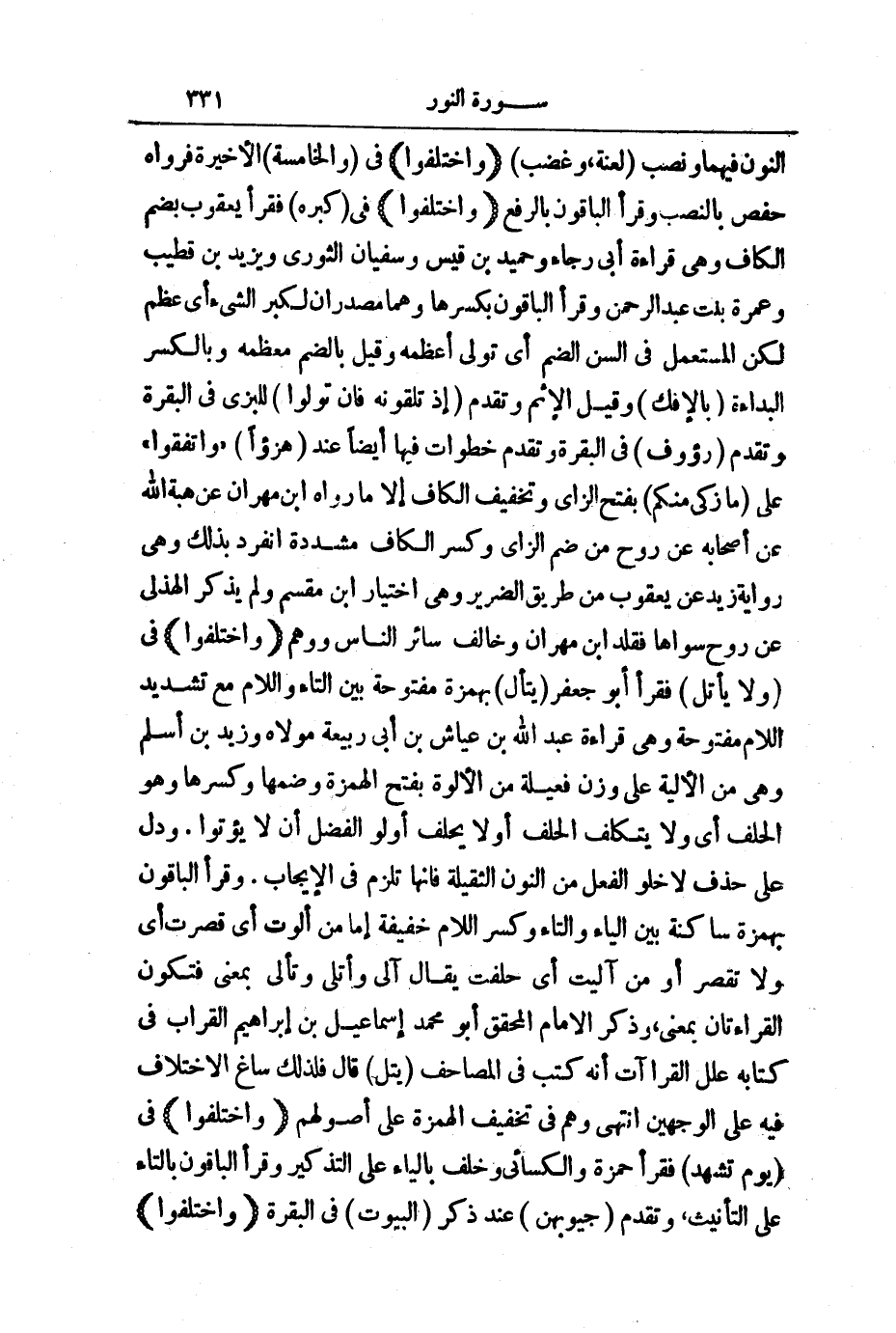 (وَاخْتَلَفُوا) فِي: كِبْرَهُ فَقَرَأَ يَعْقُوبُ بِضَمِّ الْكَافِ، وَهِيَ قِرَاءَةُ أَبِي رَجَاءٍ وَحُمَيْدِ بْنِ قَيْسٍ وَسُفْيَانَ الثَّوْرِيِّ وَيَزِيدَ بْنِ قُطَيْبٍ وَعَمْرَةَ بِنْتِ عَبْدِ الرَّحْمَنِ، وَقَرَأَ الْبَاقُونَ بِكَسْرِهَا، وَهُمَا مَصْدَرَانِ لِكَبُرَ الشَّيْءُ أَيْ عَظُمَ لَكِنَّ الْمُسْتَعْمَلَ فِي السِّنِّ الضَّمُّ أَيْ وَقِيلَ بِالضَّمِّ مُعْظَمُهُ وَبِالْكَسْرِ الْبَدَاءَةُ بِالْإِفْكِ وَقِيلَ الْإِثْمُ، وَتَقَدَّمَ (إِذْ تَلَقَّوْنَهُ) (فَإِنْ تَوَلَّوْا) لِلْبَزِّيِّ فِي الْبَقَرَةِ، وَتَقَدَّمَ رَءُوفٌ فِي الْبَقَرَةِ، وَتَقَدَّمَ خُطُوَاتِ فِيهَا أَيْضًا عِنْدَ هُزُوًا.