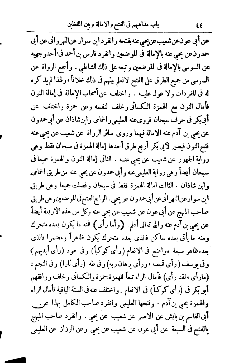 عَنْ أَبِي عَوْنٍ عَنْ شُعَيْبٍ عَنْ يَحْيَى عَنْهُ بِفَتْحِهِ، وَانْفَرَدَ ابْنُ سَوَّارٍ عَنِ النَّهْرَوَانِيِّ عَنْ أَبِي حَمْدُونَ عَنْ يَحْيَى عَنْهُ بِالْإِمَالَةِ فِي الْمَوْضِعَيْنِ، وَانْفَرَدَ فَارِسُ بْنُ أَحْمَدَ فِي إِحْدَى وَجْهَيْهِ عَنِ السُّوسِيِّ بِالْإِمَالَةِ فِي الْمَوْضِعَيْنِ وَتَبِعَهُ عَلَى ذَلِكَ الشَّاطِبِيُّ. وَأَجْمَعَ الرُّوَاةُ عَنِ السُّوسِيِّ مِنْ جَمِيعِ الطُّرُقِ عَلَى الْفَتْحِ لَا نَعْلَمُ بَيْنَهُمْ فِي ذَلِكَ خِلَافًا، وَلِهَذَا لَمْ يَذْكُرْهُ لَهُ فِي الْمُفْرَدَاتِ وَلَا عَوَّلَ عَلَيْهِ. وَاخْتُلِفَ عَنْ أَصْحَابِ الْإِمَالَةِ فِي إِمَالَةِ النُّونِ فَأَمَالَ النُّونَ مَعَ الْهَمْزَةِ الْكِسَائِيُّ وَخَلَفٌ لِنَفْسِهِ، وَعَنْ حَمْزَةَ، وَاخْتُلِفَ عَنْ أَبِي بَكْرٍ فِي حَرْفِ سُبْحَانَ، فَرَوَى عَنْهُ الْعُلَيْمِيُّ وَالْحَمَّامِيُّ، وَابْنُ شَاذَانَ عَنْ أَبِي حَمْدُونَ عَنْ يَحْيَى بْنِ آدَمَ عَنْهُ الْإِمَالَةَ فِيهِمَا، وَرَوَى سَائِرُ الرُّوَاةِ عَنْ شُعَيْبٍ عَنْ يَحْيَى عَنْهُ فَتَحَ النُّونِ فَيَصِيرُ لِأَبِي بَكْرٍ أَرْبَعُ طُرُقٍ أَحَدُهَا إِمَالَةُ الْهَمْزَةِ فِي سُبْحَانَ فَقَطْ، وَهِيَ رِوَايَةُ الْجُمْهُورِ عَنْ شُعَيْبٍ عَنْ يَحْيَى عَنْهُ. الثَّانِي إِمَالَةُ النُّونِ وَالْهَمْزَةِ جَمِيعًا فِي سُبْحَانَ أَيْضًا، وَهِيَ رِوَايَةُ الْعُلَيْمِيِّ عَنْهُ، وَأَبِي حَمْدُونَ عَنْ يَحْيَى عَنْهُ مِنْ طَرِيقِ الْحَمَّامِيِّ، وَابْنِ شَاذَانَ. الثَّالِثُ إِمَالَةُ الْهَمْزَةِ فَقَطْ فِي سُبْحَانَ وَفُصِّلَتْ جَمِيعًا، وَهِيَ طَرِيقُ ابْنِ سَوَّارٍ عَنِ النَّهْرَانِيِّ عَنْ أَبِي حَمْدُونَ عَنْ يَحْيَى. الرَّابِعُ الْفَتْحُ فِي الْمَوْضِعَيْنِ، وَهِيَ طَرِيقُ صَاحِبِ الْمُبْهِجِ عَنْ أَبِي عَوْنٍ عَنْ شُعَيْبٍ عَنْ يَحْيَى عَنْهُ، وَكُلٌّ مِنْ هَذِهِ الْأَرْبَعَةِ أَيْضًا عَنْ يَحْيَى بْنِ آدَمَ عَنْهُ وَاللَّهُ تَعَالَى أَعْلَمُ.