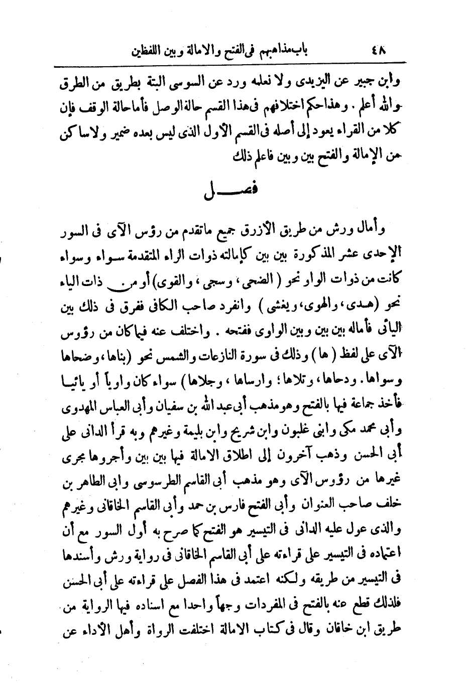 وَهَذَا حُكْمُ اخْتِلَافِهِمْ فِي الْقِسْمِ حَالَةَ الْوَصْلِ فَأَمَّا حَالَةُ الْوَقْفِ فَإِنَّ كُلًّا مِنَ الْقُرَّاءِ يَعُودُ إِلَى أَصْلِهِ فِي الْقِسْمِ الْأَوَّلِ الَّذِي لَيْسَ بَعْدَهُ ضَمِيرٌ، وَلَا سَاكِنٌ مِنَ الْإِمَالَةِ وَالْفَتْحِ بَيْنَ وَبَيْنَ فَاعْلَمْ ذَلِكَ.