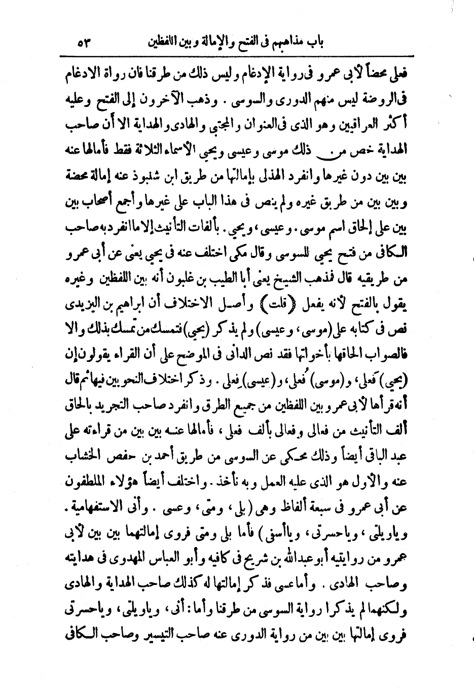 فَعْلَى مَحْضًا لِأَبِي عَمْرٍو فِي رِوَايَةِ الْإِدْغَامِ وَلَيْسَ ذَلِكَ مِنْ طُرُقِنَا فَإِنَّ رُوَاةَ الْإِدْغَامِ فِي الرَّوْضَةِ لَيْسَ مِنْهُمُ الدُّورِيُّ وَالسُّوسِيُّ. وَذَهَبَ الْآخَرُونَ إِلَى الْفَتْحِ، وَعَلَيْهِ أَكْثَرُ الْعِرَاقِيِّينَ، وَهُوَ الَّذِي فِي الْعُنْوَانِ وَالْمُجْتَبَى وَالْهَادِي، وَالْهِدَايَةِ، إِلَّا أَنَّ صَاحِبَ الْهِدَايَةِ خَصَّ مِنْ ذَلِكَ مُوسَى، وَعِيسَى، وَيَحْيَى الْأَسْمَاءَ الثَّلَاثَةَ فَقَطْ فَأَمَالَهَا عَنْهُ بَيْنَ بَيْنَ دُونِ غَيْرِهَا، وَانْفَرَدَ الْهُذَلِيُّ بِإِمَالَتِهَا مِنْ طَرِيقِ ابْنِ شَنَبُوذَ عَنْهُ إِمَالَةً مَحْضَةً وَبَيْنَ بَيْنَ مِنْ طَرِيقِ غَيْرِهِ، وَلَمْ يَنُصَّ فِي هَذَا الْبَابِ عَلَى غَيْرِهَا وَأَجْمَعَ أَصْحَابُ بَيْنَ بَيْنَ عَلَى إِلْحَاقِ اسْمِ مُوسَى. وَعِيسَى، وَيَحْيَى. بِأَلِفَاتِ التَّأْنِيثِ إِلَّا مَا انْفَرَدَ بِهِ صَاحِبُ الْكَافِي مِنْ فَتْحِ يَحْيَى لِلسُّوسِيِّ، وَقَالَ: مَكِّيٌّ اخْتُلِفَ عَنْهُ فِي يَحْيَى يَعْنِي عَنْ أَبِي عَمْرٍو مِنْ طَرِيقَتِهِ قَالَ: فَذَهَبَ الشَّيْخُ يَعْنِي أَبَا الطِّيبِ بْنَ غَلْبُونَ أَنَّهُ بَيْنَ اللَّفْظَيْنِ، وَغَيْرُهُ يَقُولُ بِالْفَتْحِ لِأَنَّهُ يَفْعَلُ (قُلْتُ) : وَأَصْلُ الِاخْتِلَافِ أَنَّ إِبْرَاهِيمَ بْنَ الْيَزِيدِيِّ نَصَّ عَلَى كِتَابِهِ عَلَى مُوسَى، عِيسَى، وَلَمْ يَذْكُرْ يَحْيَى فَتَمَسَّكَ مَنْ تَمَسَّكَ بِذَلِكَ وَإِلَّا فَالصَّوَابُ إِلْحَاقُهَا بِأَخَوَاتِهَا، فَقَدْ نَصَّ الدَّانِيُّ فِي الْمُوَضِّحِ عَلَى أَنَّ الْقُرَّاءَ يَقُولُونَ إِنَّ يَحْيَى فَعْلَى، وَمُوسَى فُعْلَى، وَعِيسَى فِعْلَى. وَذَكَرَ اخْتِلَافَ النَّحْوِيِّينَ فِيهَا ثُمَّ قَالَ: إِنَّهُ قَرَأَهَا لِأَبِي عَمْرٍو بَيْنَ اللَّفْظَيْنِ مِنْ جَمِيعِ الطُّرُقِ، وَانْفَرَدَ صَاحِبُ التَّجْرِيدِ بِإِلْحَاقِ أَلِفِ التَّأْنِيثِ مِنْ فَعَالَى، وَفُعَالَى بِأَلِفِ فَعْلَى، فَأَمَالَهَا عَنْهُ بَيْنَ بَيْنَ مَنْ قِرَاءَتُهُ عَلَى عَبْدِ الْبَاقِي أَيْضًا، وَذَلِكَ مَحْكِيٌّ عَنِ السُّوسِيِّ مِنْ طَرِيقِ أَحْمَدَ بْنِ حَفْصٍ الْخَشَّابِ عَنْهُ وَالْأَوَّلُ هُوَ الَّذِي عَلَيْهِ الْعَمَلُ، وَبِهِ نَأْخُذُ. وَاخْتَلَفَ أَيْضًا هَؤُلَاءِ الْمُلَطِّفُونَ عَنْ أَبِي عَمْرٍو فِي سَبْعَةِ أَلْفَاظٍ، وَهِيَ بَلَى، مَتَى، عَسَى. أَنَّى الِاسْتِفْهَامِيَّةُ. يَاوَيْلَتَى، يَاحَسْرَتَى، يَاأَسَفَى فَأَمَّا بَلَى وَمَتَى، فَرَوَى إِمَالَتَهَا بَيْنَ بَيْنَ لِأَبِي عَمْرٍو مِنْ رِوَايَتَيْهِ أَبُو عَبْدِ اللَّهِ بْنُ شُرَيْحٍ فِي كَافِيهِ، وَأَبُو الْعَبَّاسِ الْمَهْدَوِيُّ فِي هِدَايَتِهِ، وَصَاحِبُ الْهَادِي.