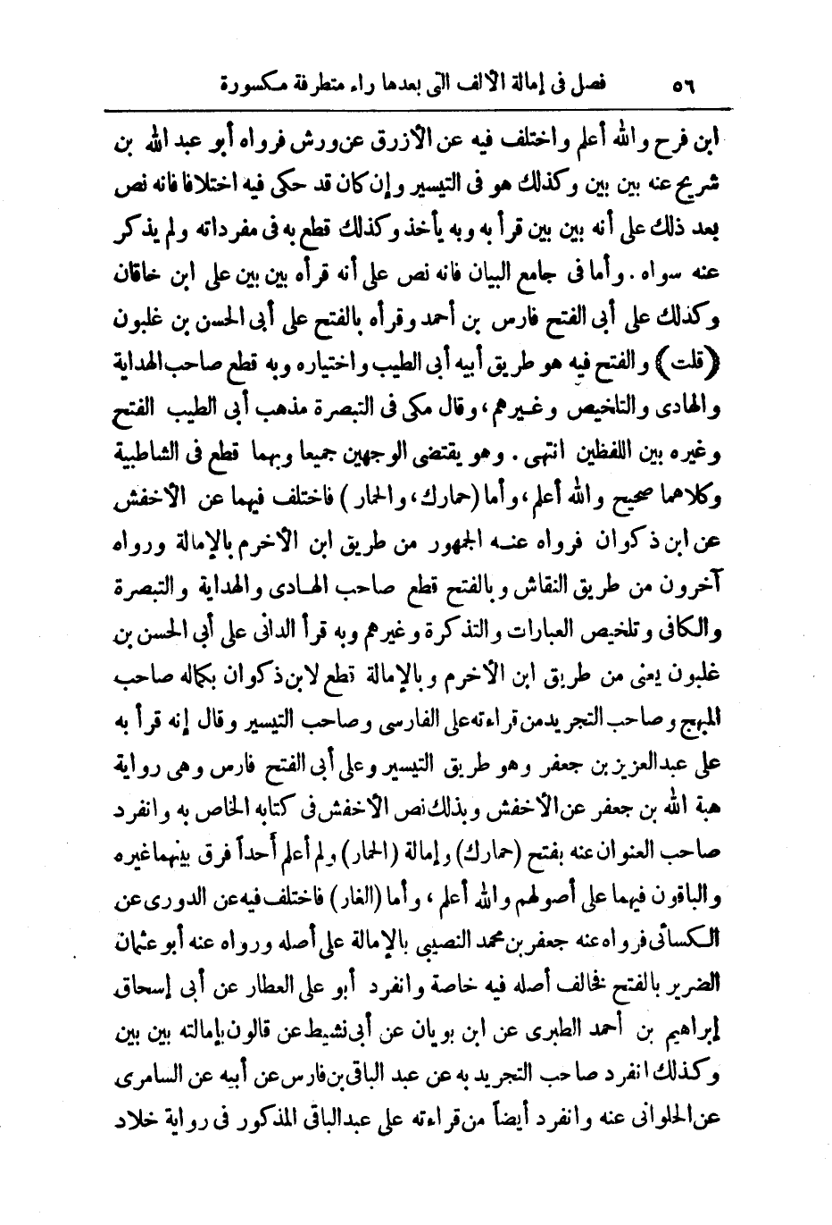 وَأَمَّا حِمَارِكَ، الْحِمَارِ فَاخْتُلِفَ فِيهِمَا عَنِ الْأَخْفَشِ عَنِ ابْنِ ذَكْوَانَ فَرَوَاهُ عَنْهُ الْجُمْهُورُ مِنْ طَرِيقِ ابْنِ الْأَخْرَمِ بِالْإِمَالَةِ، وَرَوَاهُ آخَرُونَ مِنْ طَرِيقِ النَّقَّاشِ وَبِالْفَتْحِ قَطَعَ صَاحِبُ الْهَادِي، وَالْهِدَايَةِ، وَالتَّبْصِرَةِ، وَالْكَافِي، وَتَلْخِيصِ الْعِبَارَاتِ وَالتَّذْكِرَةِ، وَغَيْرُهُمْ، وَبِهِ قَرَأَ الدَّانِيُّ عَلَى أَبِي الْحَسَنِ بْنِ غَلْبُونَ يَعْنِي مِنْ طَرِيقِ ابْنِ الْأَخْرَمِ وَبِالْإِمَالَةِ قَطَعَ لِابْنِ ذَكْوَانَ بِكَمَالِهِ صَاحِبُ الْمُبْهِجِ، وَصَاحِبُ التَّجْرِيدِ، مِنْ قِرَاءَتِهِ عَلَى الْفَارِسِيِّ، وَصَاحِبُ التَّيْسِيرِ، وَقَالَ: إِنَّهُ قَرَأَ بِهِ عَلَى عَبْدِ الْعَزِيزِ بْنِ جَعْفَرٍ، وَهُوَ طَرِيقُ التَّيْسِيرِ وَعَلَى أَبِي الْفَتْحِ فَارِسٍ، وَهِيَ رِوَايَةُ صَاحِبِ الْعُنْوَانِ عَنْهُ بِفَتْحِ حِمَارِكَ، وَإِمَالَةِ الْحِمَارِ، وَلَمْ أَعْلَمْ أَحَدًا فَرَّقَ بَيْنَهُمَا غَيْرُهُ وَالْبَاقُونَ فِيهِمَا عَلَى أُصُولِهِمْ - وَاللَّهُ أَعْلَمُ -.