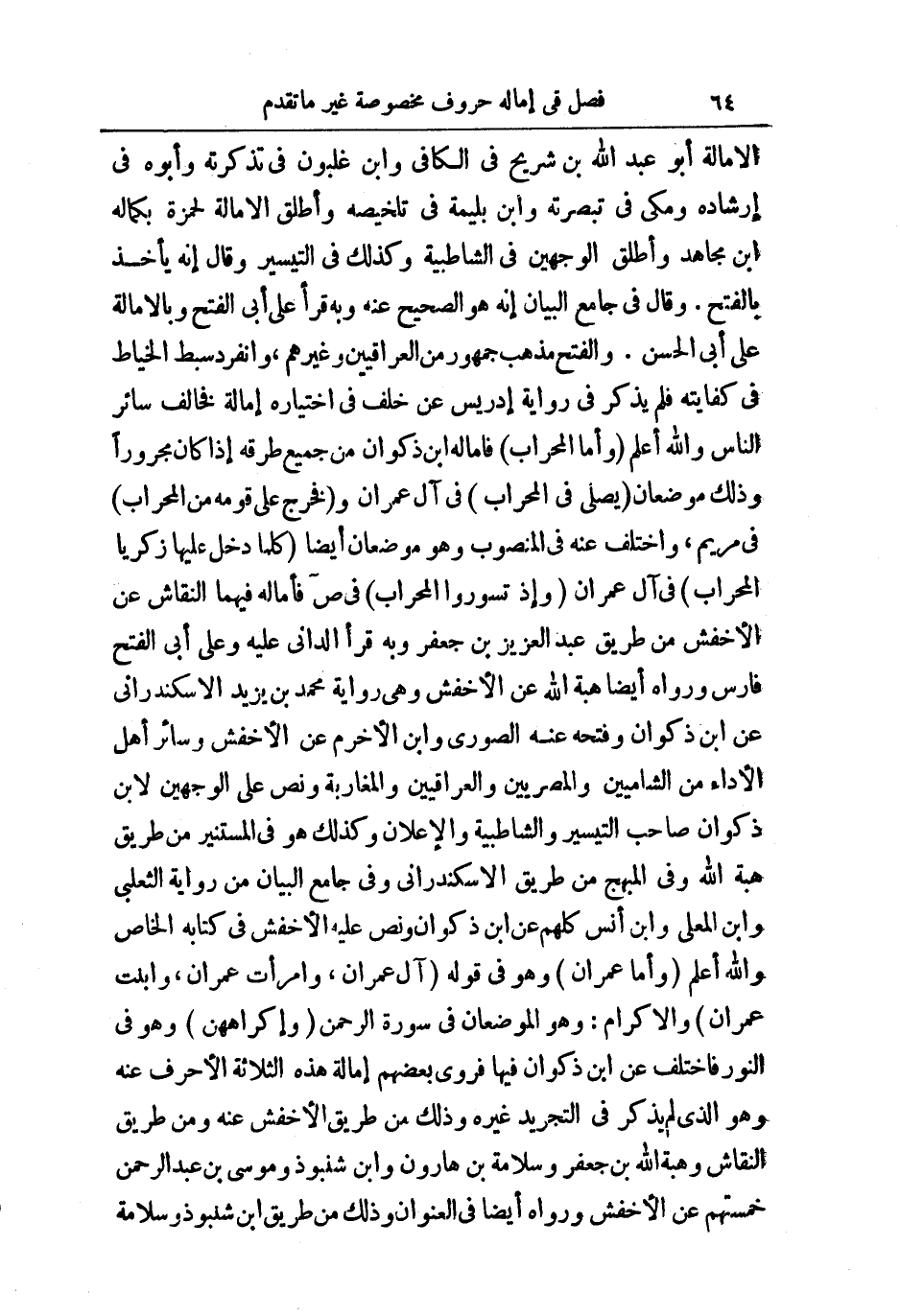 وَأَمَّا الْمِحْرَابِ فَأَمَالَهُ ابْنُ ذَكْوَانَ مِنْ جَمِيعِ طُرُقِهِ إِذَا كَانَ مَجْرُورًا، وَذَلِكَ مَوْضِعَانِ يُصَلِّي فِي الْمِحْرَابِ فِي آلِ عِمْرَانَ وَفَخَرَجَ عَلَى قَوْمِهِ مِنَ الْمِحْرَابِ فِي مَرْيَمَ، وَاخْتُلِفَ عَنْهُ فِي الْمَنْصُوبِ، وَهُوَ مَوْضِعَانِ أَيْضًا كُلَّمَا دَخَلَ عَلَيْهَا زَكَرِيَّا الْمِحْرَابَ فِي آلِ عِمْرَانَ، وَإِذْ تَسَوَّرُوا الْمِحْرَابَ فِي ص فَأَمَالَهُ فِيهِمَا النَّقَّاشُ عَنِ الْأَخْفَشِ مِنْ طَرِيقِ عَبْدِ الْعَزِيزِ بْنِ جَعْفَرٍ، وَبِهِ قَرَأَ الدَّانِيُّ عَلَيْهِ، وَعَلَى أَبِي الْفَتْحِ فَارِسٍ، وَرَوَاهُ أَيْضًا هِبَةُ اللَّهِ عَنِ الْأَخْفَشِ، وَهِيَ رِوَايَةُ مُحَمَّدِ بْنِ يَزِيدٍ الْإِسْكَنْدَرَانِيِّ عَنِ ابْنِ ذَكْوَانَ وَفَتَحَهُ عَنْهُ الصُّورِيُّ وَابْنُ الْأَخْرَمِ عَنِ الْأَخْفَشِ وَسَائِرُ أَهْلِ الْأَدَاءِ مِنَ الشَّامِيِّينَ، وَالْمِصْرِيِّينَ، وَالْعِرَاقِيِّينَ، وَالْمَغَارِبَةِ، وَنَصَّ عَلَى الْوَجْهَيْنِ لِابْنِ ذَكْوَانَ صَاحِبُ التَّيْسِيرِ، وَالشَّاطِبِيَّةِ، وَالْإِعْلَانِ، وَكَذَلِكَ هُوَ فِي الْمُسْتَنِيرِ مِنْ طَرِيقِ هِبَةِ اللَّهِ، وَفِي الْمُبْهِجِ مِنْ طَرِيقِ الْإِسْكَنْدَرَانِيِّ، وَفِي جَامِعِ الْبَيَانِ مِنْ رِوَايَةِ الثَّعْلَبِيِّ وَابْنِ الْمُعَلَّى وَابْنِ أَنَسٍ كُلِّهِمْ عَنِ ابْنِ ذَكْوَانَ، وَنَصَّ عَلَيْهِ الْأَخْفَشُ فِي كِتَابِهِ الْخَاصِّ - وَاللَّهُ أَعْلَمُ -.