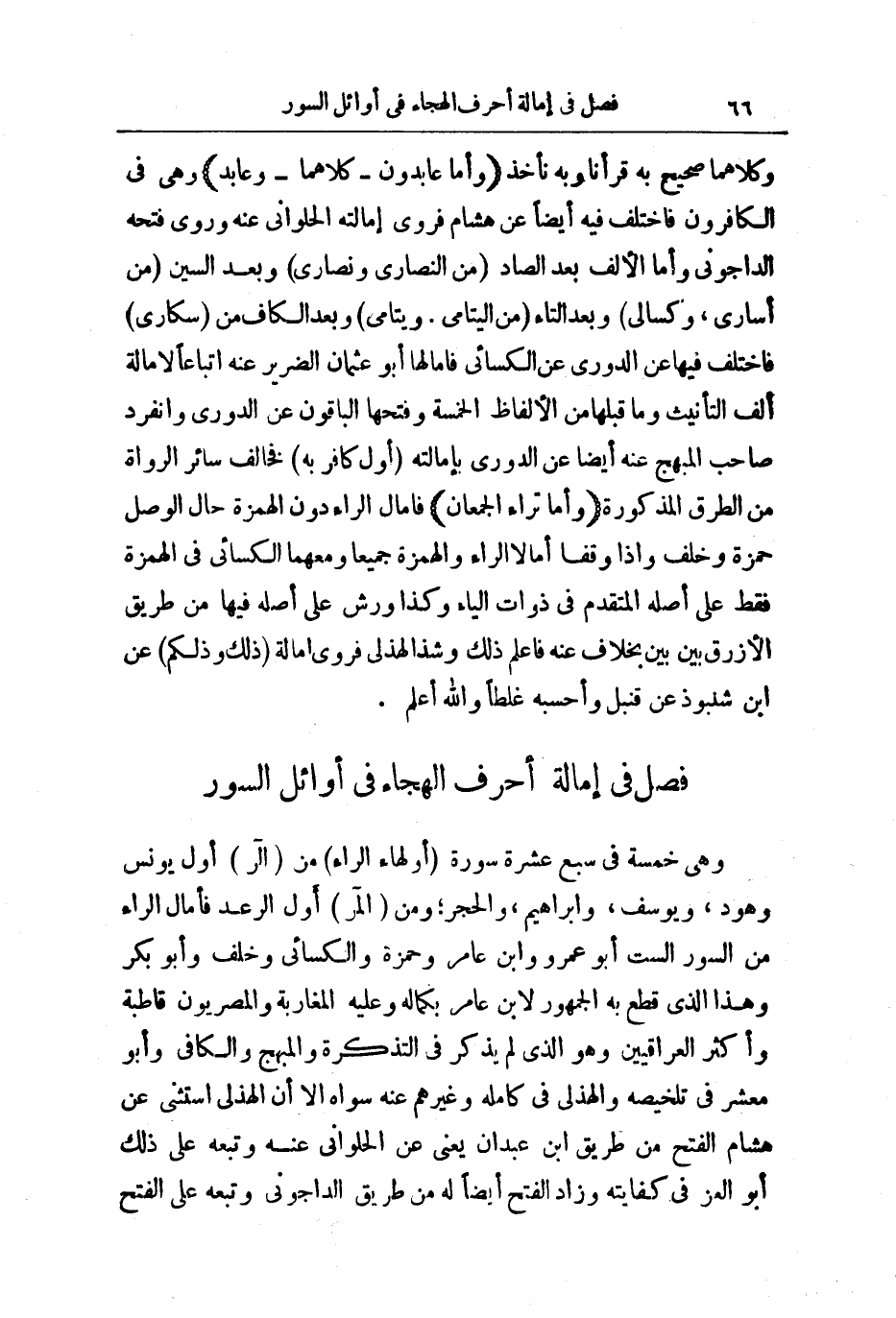 ، وَكِلَاهُمَا صَحِيحٌ بِهِ قَرَأْنَا، وَبِهِ نَأْخُذُ وَأَمَّا عَابِدُونَ - كِلَاهُمَا - وَعَابِدٌ، وَهِيَ فِي الْكَافِرُونَ فَاخْتُلِفَ فِيهِ أَيْضًا عَنْ هِشَامٍ، فَرَوَى إِمَالَتَهُ الْحُلْوَانِيُّ عَنْهُ، وَرَوَى فَتْحَهُ الدَّاجُونِيُّ، وَأَمَّا الْأَلِفُ بَعْدَ الصَّادِ مِنَ النَّصَارَى، نَصَارَى، وَبَعْدَ السِّينِ مِنْ أُسَارَى، كُسَالَى، وَبَعْدَ التَّاءِ مِنَ الْيَتَامَى. وَيَتَامَى، وَبَعْدَ الْكَافِ مِنْ سُكَارَى فَاخْتُلِفَ فِيهَا عَنِ الدُّورِيِّ عَنِ الْكِسَائِيِّ فَأَمَالَهَا أَبُو عُثْمَانَ الضَّرِيرُ عَنْهُ تِبَاعًا لِإِمَالَةِ أَلِفِ التَّأْنِيثِ وَمَا قَبْلَهَا مِنَ الْأَلْفَاظِ الْخَمْسَةِ وَفَتَحَهَا الْبَاقُونَ عَنِ الدُّورِيِّ، وَانْفَرَدَ صَاحِبُ الْمُبْهِجِ عَنْهُ أَيْضًا عَنِ الدُّورِيِّ بِإِمَالَتِهِ أَوَّلَ كَافِرٍ بِهِ فَخَالَفَ سَائِرَ الرُّوَاةِ مِنَ الطُّرُقِ الْمَذْكُورَةِ وَأَمَالَ تَرَاءَ الْجَمْعَانِ فَأَمَالَ الرَّاءَ دُونَ الْهَمْزَةِ حَالَ الْوَصْلِ حَمْزَةُ وَخَلَفٌ، وَإِذَا وَقَفَا أَمَالَا الرَّاءَ وَالْهَمْزَةَ جَمِيعًا وَمَعَهُمَا الْكِسَائِيُّ فِي الْهَمْزَةِ فَقَطْ عَلَى أَصْلِهِ الْمُتَقَدِّمِ فِي ذَوَاتِ الْيَاءِ، وَكَذَا وَرْشٌ عَلَى أَصْلِهِ فِيهَا مِنْ طَرِيقِ الْأَزْرَقِ بَيْنَ بَيْنَ بِخِلَافٍ عَنْهُ فَاعْلَمْ ذَلِكَ وَشَذَّ الْهُذَلِيُّ، فَرَوَى إِمَالَةَ ذَلِكَ، ذَلِكُمْ عَنِ ابْنِ شَنَبُوذَ عَنْ قُنْبُلٍ وَأَحْسَبُهُ غَلَطًا - وَاللَّهُ أَعْلَمُ -.