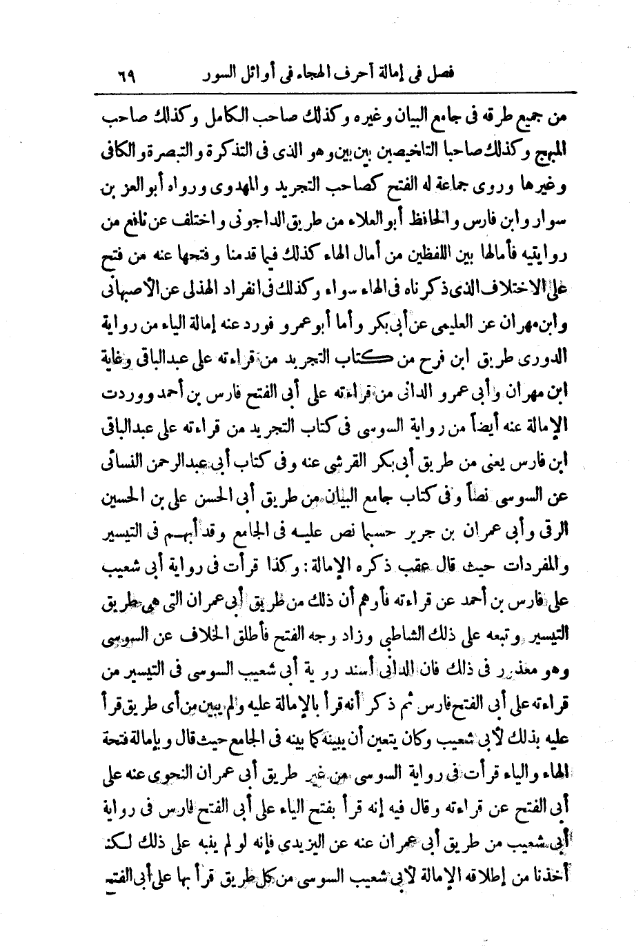 وَكَانَ يَتَعَيَّنُ أَنْ يُبَيِّنَهُ كَمَا بَيَّنَهُ فِي الْجَامِعِ حَيْثُ قَالَ: وَبِإِمَالَةِ فَتْحَةِ الْهَاءِ وَالْيَاءِ قَرَأْتُ فِي رِوَايَةِ السُّوسِيِّ مِنْ غَيْرِ طَرِيقِ أَبِي عِمْرَانَ النَّحْوِيِّ عَنْهُ عَلَى أَبِي الْفَتْحِ عَنْ قِرَاءَتِهِ، وَقَالَ فِيهِ: إِنَّهُ قَرَأَ بِفَتْحِ الْيَاءِ عَلَى أَبِي الْفَتْحِ فَارِسٍ فِي رِوَايَةِ أَبِي شُعَيْبٍ مِنْ طَرِيقِ أَبِي عِمْرَانَ عَنْهُ عَنِ الْيَزِيدِيِّ فَإِنَّهُ لَوْ لَمْ يُنَبِّهْ عَلَى ذَلِكَ لَكُنَّا أَخَذْنَا مِنْ إِطْلَاقِهِ الْإِمَالَةَ لِأَبِي شُعَيْبٍ السُّوسِيِّ مِنْ كُلِّ طَرِيقٍ قَرَأَ بِهَا عَلَى أَبِي الْفَتْحِ
