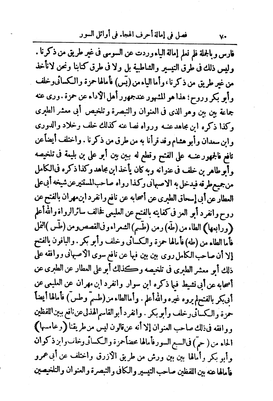 وَبِالْجُمْلَةِ فَلَمْ نَعْلَمْ إِمَالَةَ الْيَاءِ وَرَدَتْ عَنِ السُّوسِيِّ فِي غَيْرِ طَرِيقٍ مِنْ ذِكْرِنَا وَلَيْسَ ذَلِكَ فِي طَرِيقِ التَّيْسِيرِ، وَالشَّاطِبِيَّةِ، بَلْ وَلَا فِي طُرُقِ كِتَابِنَا، وَنَحْنُ لَا نَأْخُذُ مِنْ غَيْرِ طَرِيقِ مَنْ ذَكَرْنَا، وَأَمَّا الْيَاءُ مِنْ يس فَأَمَالَهَا حَمْزَةُ وَالْكِسَائِيُّ وَخَلَفٌ وَأَبُو بَكْرٍ وَرَوْحٌ ; هَذَا هُوَ الْمَشْهُورُ عِنْدَ جُمْهُورِ أَهْلِ الْأَدَاءِ عَنْ حَمْزَةَ. رَوَى عَنْهُ جَمَاعَةٌ بَيْنَ بَيْنَ، وَهُوَ الَّذِي فِي الْعُنْوَانِ وَالتَّبْصِرَةِ، وَتَلْخِيصِ أَبِي مَعْشَرٍ الطَّبَرِيِّ، وَكَذَا ذَكَرَهُ ابْنُ مُجَاهِدٍ عَنْهُ، وَرَوَاهُ نَصًّا عَنْهُ كَذَلِكَ خَلَفٌ وَخَلَّادٌ وَالدُّورِيُّ وَابْنُ سَعْدَانَ وَأَبُو هِشَامٍ، وَقَدْ قَرَأْنَا بِهِ مِنْ طُرُقِ مَنْ ذَكَرْنَا.