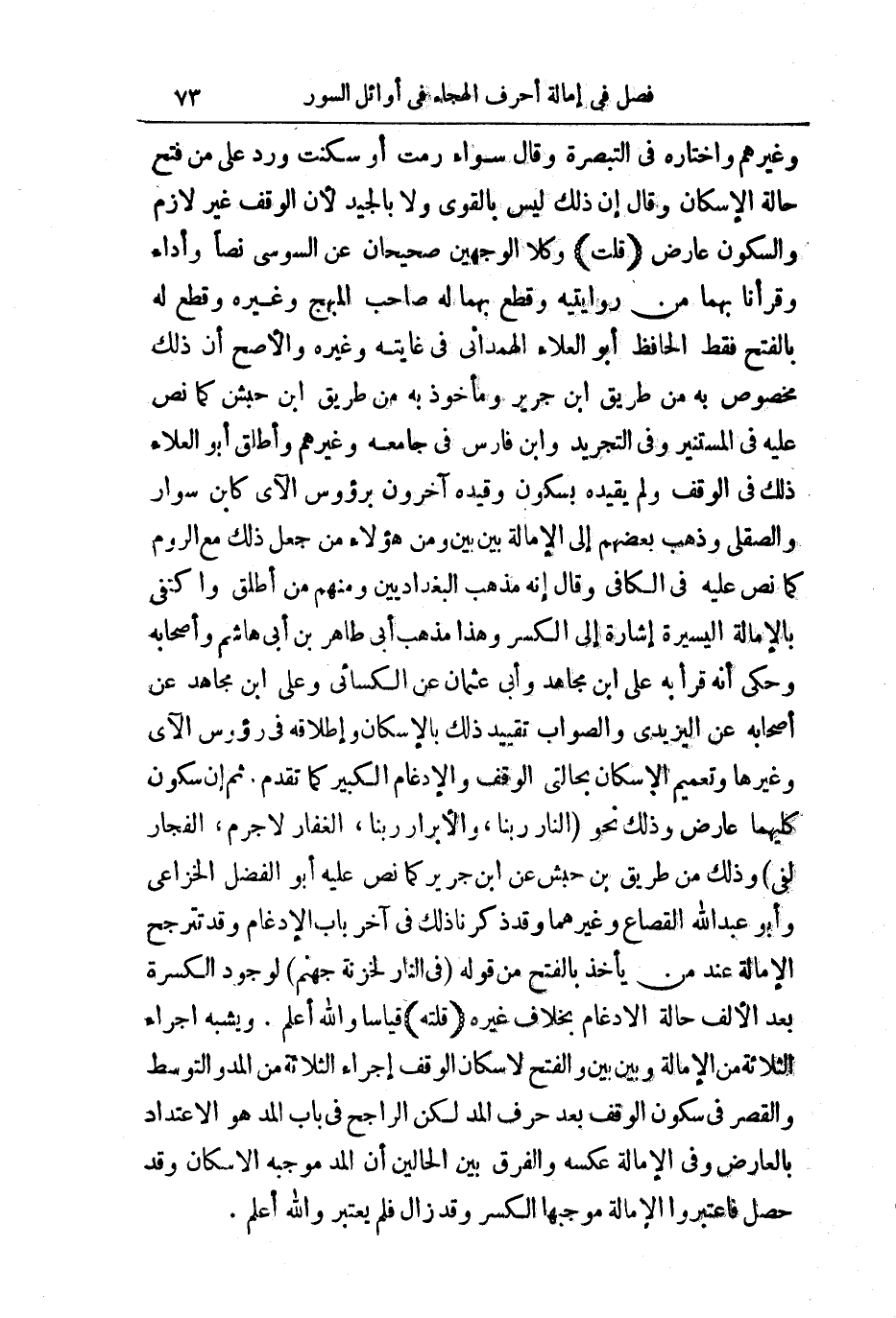 ، وَغَيْرِهِمْ، وَاخْتَارَهُ فِي التَّبْصِرَةِ، وَقَالَ: سَوَاءٌ رُمْتَ، أَوْ سَكَّنْتَ وَرَدَّ عَلَى مَنْ فَتَحَ حَالَةَ الْإِسْكَانِ، وَقَالَ: إِنَّ ذَلِكَ لَيْسَ بِالْقَوِيِّ، وَلَا بِالْجِيدِ لِأَنَّ الْوَقْفَ غَيْرُ لَازِمٍ وَالسُّكُونَ عَارِضٌ (قُلْتُ) : وَكِلَا الْوَجْهَيْنِ صَحِيحَانِ عَنِ السُّوسِيِّ نَصًّا وَأَدَاءً، وَقَرَأْنَا بِهِمَا مِنْ رِوَايَتَيْهِ، وَقَطَعَ بِهِمَا لَهُ صَاحِبُ الْمُبْهِجِ، وَغَيْرُهُ، وَقَطَعَ لَهُ بِالْفَتْحِ فَقَطِ الْحَافِظُ أَبُو الْعَلَاءِ الْهَمْدَانِيُّ فِي غَايَتِهِ، وَغَيْرِهِ وَالْأَصَحُّ أَنَّ ذَلِكَ مَخْصُوصٌ بِهِ مِنْ طَرِيقِ ابْنِ جَرِيرٍ وَمَأْخُوذٌ بِهِ مِنْ طَرِيقِ ابْنِ حَبَشٍ كَمَا نَصَّ عَلَيْهِ فِي الْمُسْتَنِيرِ، وَفِي التَّجْرِيدِ، وَابْنُ فَارِسٍ فِي جَامِعِهِ، وَغَيْرُهُمْ وَأَطْلَقَ أَبُو الْعَلَاءِ ذَلِكَ فِي الْوَقْفِ، وَلَمْ يُقَيِّدْهُ بِسُكُونٍ وَقَيَّدَهُ آخَرُونَ بِرُءُوسِ الْآيِ كَابْنِ سَوَّارٍ وَالصِّقِلِّيِّ وَذَهَبَ بَعْضُهُمْ إِلَى الْإِمَالَةِ بَيْنَ بَيْنَ، وَمِنْ هَؤُلَاءِ مِنْ جَعَلَ ذَلِكَ مَعَ الرَّوْمِ كَمَا نَصَّ عَلَيْهِ فِي الْكَافِي، وَقَالَ: إِنَّهُ مَذْهَبُ الْبَغْدَادِيِّينَ، وَمِنْهُمْ مَنْ أَطْلَقَ وَاكْتَفَى بِالْإِمَالَةِ الْيَسِيرَةِ إِشَارَةً إِلَى الْكَسْرِ، وَهَذَا مَذْهَبُ أَبِي طَاهِرِ بْنِ أَبِي هَاشِمٍ وَأَصْحَابِهِ وَحُكِيَ أَنَّهُ قَرَأَ بِهِ عَلَى ابْنِ مُجَاهِدٍ وَأَبِي عُثْمَانَ عَنِ الْكِسَائِيِّ، وَعَلَى ابْنِ مُجَاهِدٍ عَنْ أَصْحَابِهِ عَنِ الْيَزِيدِيِّ وَالصَّوَابُ تَقْيِيدُ ذَلِكَ بِالْإِسْكَانِ وَإِطْلَاقُهُ فِي رُءُوسِ الْآيِ، وَغَيْرِهَا. وَتَعْمِيمُ الْإِسْكَانِ بِحَالَتَيِ الْوَقْفِ وَالْإِدْغَامِ الْكَبِيرِ كَمَا تَقَدَّمَ ثُمَّ إِنَّ سُكُونَ كِلَيْهِمَا عَارِضٌ، وَذَلِكَ نَحْوَ النَّارِ رَبَّنَا، الْأَبْرَارِ رَبَّنَا، الْغَفَّارِ لَا جَرَمَ، الْفُجَّارَ لَفِي، وَذَلِكَ مِنْ طَرِيقِ ابْنِ حَبَشٍ عَنِ ابْنِ جَرِيرٍ كَمَا نَصَّ عَلَيْهِ أَبُو الْفَضْلِ الْخُزَاعِيُّ وَأَبُو عَبْدِ اللَّهِ الْقَصَّاعِ، وَغَيْرُهُمَا، وَقَدْ ذَكَرْنَا ذَلِكَ فِي آخِرِ بَابِ الْإِدْغَامِ، وَقَدْ تَتَرَجَّحُ الْإِمَالَةُ عِنْدَ مَنْ يَأْخُذُ بِالْفَتْحِ مِنْ قَوْلِهِ فِي النَّارِ لِخَزَنَةِ جَهَنَّمَ لِوُجُودِ الْكَسْرَةِ بَعْدَ الْأَلِفِ حَالَةَ الْإِدْغَامِ بِخِلَافِ غَيْرِهِ (قُلْتُهُ) قِيَاسًا - وَاللَّهُ أَعْلَمُ -.
