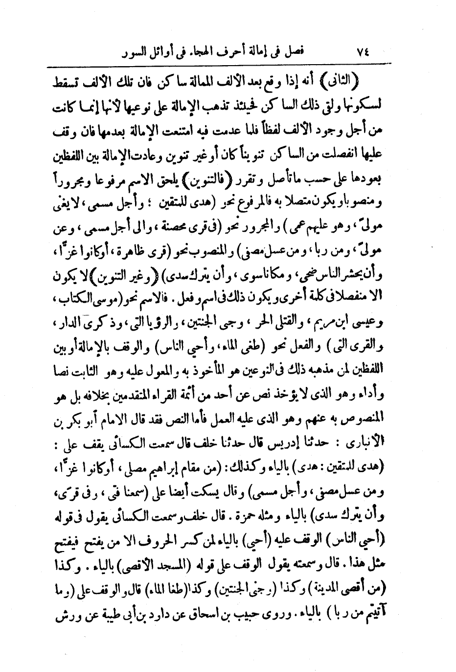 وَالْوَقْفُ بِالْإِمَالَةِ، أَوْ بَيْنَ اللَّفْظَيْنِ لِمَنْ مَذْهَبُهُ ذَلِكَ فِي النَّوْعَيْنِ هُوَ الْمَأْخُوذُ بِهِ وَالْمُعَوَّلُ عَلَيْهِ، وَهُوَ الثَّابِتُ نَصًّا وَأَدَاءً، وَهُوَ الَّذِي لَا يُؤْخَذُ نَصًّا عَنْ أَحَدٍ مِنْ أَئِمَّةِ الْقُرَّاءِ الْمُتَقَدِّمِينَ بِخِلَافِهِ، بَلْ هُوَ الْمَنْصُوصُ بِهِ عَنْهُمْ، وَهُوَ الَّذِي عَلَيْهِ الْعَمَلُ فَأَمَّا النَّصُّ، فَقَدْ قَالَ الْإِمَامُ أَبُو بَكْرِ بْنُ الْأَنْبَارِيُّ: حَدَّثَنَا إِدْرِيسُ قَالَ: حَدَّثَنَا خَلَفٌ قَالَ: سَمِعْتُ الْكِسَائِيَّ يَقِفُ عَلَى: هُدًى لِلْمُتَّقِينَ بِالْيَاءِ، وَكَذَلِكَ: مِنْ مَقَامِ إِبْرَاهِيمَ مُصَلًّى، أَوْ كَانُوا غُزًّا، مِنْ عَسَلٍ مُصَفًّى، أَجَلٍ مُسَمًّى، وَقَالَ: يَسْكُتُ أَيْضًا عَلَى سَمِعْنَا فَتًى، فِي قُرًى، أَنْ يُتْرَكَ سُدًى بِالْيَاءِ وَمِثْلُهُ حَمْزَةُ. قَالَ: خَلَفٌ وَسَمِعْتُ الْكِسَائِيَّ يَقُولُ فِي قَوْلِهِ أَحْيَا النَّاسَ الْوَقْفُ عَلَيْهِ أَحْيَا بِالْيَاءِ لِمَنْ كَسَرَ الْحُرُوفَ إِلَّا مَنْ يَفْتَحُ فَيَفْتَحُ مِثْلَ هَذَا.