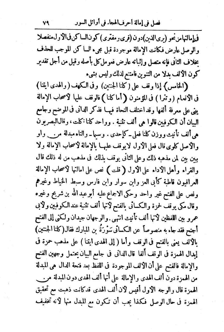 (الْخَامِسُ) إِذَا وَقَفَ عَلَى كِلْتَا الْجَنَّتَيْنِ، فِي الْكَهْفِ الْهُدَى ائْتِنَا فِي الْأَنْعَامِ تَتْرَى فِي الْمُؤْمِنُونَ أَمَّا كِلْتَا فَالْوَقْفُ عَلَيْهَا لِأَصْحَابِ الْإِمَالَةِ يُبْنَى عَلَى مَعْرِفَةِ أَلِفِهَا.