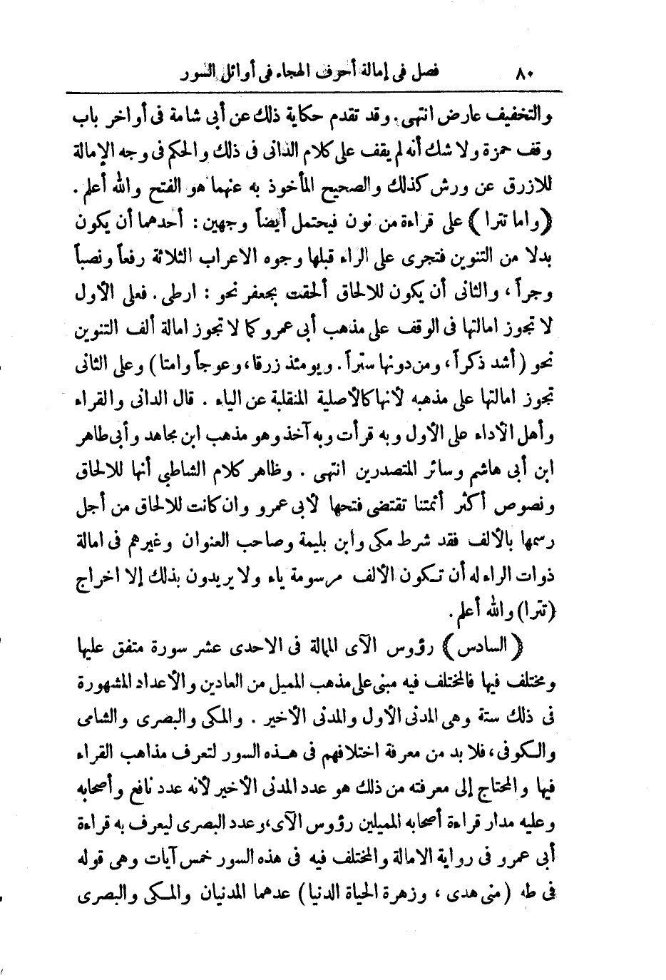 (السَّادِسُ) رُءُوسُ الْآيِ الْمُمَالَةِ فِي الْإِحْدَى عَشَرَ سُورَةً مُتَّفَقٌ عَلَيْهَا وَمُخْتَلَفٌ فِيهَا، فَالْمُخْتَلَفُ فِيهِ مَبْنِيٌّ عَلَى مَذْهَبِ الْمُمِيلِ مِنَ الْعَادِّينَ وَالْأَعْدَادُ الْمَشْهُورَةُ فِي ذَلِكَ سِتَّةٌ، وَهِيَ الْمَدَنِيُّ الْأَوَّلُ وَالْمَدَنِيُّ الْأَخِيرُ، وَالْمَكِّيُّ، وَالْبَصَرِيُّ، وَالشَّامِيُّ، وَالْكُوفِيُّ، فَلَا بُدَّ مِنْ مَعْرِفَةِ اخْتِلَافِهِمْ فِي هَذِهِ السُّوَرِ لِتَعْرِفَ مَذَاهِبَ الْقُرَّاءِ فِيهَا وَالْمُحْتَاجُ إِلَى مَعْرِفَتِهِ مِنْ ذَلِكَ هُوَ عَدَدُ الْمَدَنِيِّ الْأَخِيرُ لِأَنَّهُ عَدَدُ نَافِعٍ وَأَصْحَابِهِ، وَعَلَيْهِ مَدَارُ قِرَاءَةِ أَصْحَابِهِ الْمُمِيلِينَ رُءُوسَ الْآيِ، وَعَدَدُ الْبَصْرِيِّ لِيُعْرَفَ بِهِ قِرَاءَةُ أَبِي عَمْرٍو فِي رِوَايَةِ الْإِمَالَةِ وَالْمُخْتَلَفُ فِيهِ فِي هَذِهِ السُّوَرِ خَمْسُ آيَاتٍ، وَهِيَ قَوْلُهُ فِي طه مِنِّي هُدًى، زَهْرَةَ الْحَيَاةِ الدُّنْيَا عَدَّهُمَا الْمَدَنِيَّانِ، وَالْمَكِّيُّ، وَالْبَصَرِيُّ