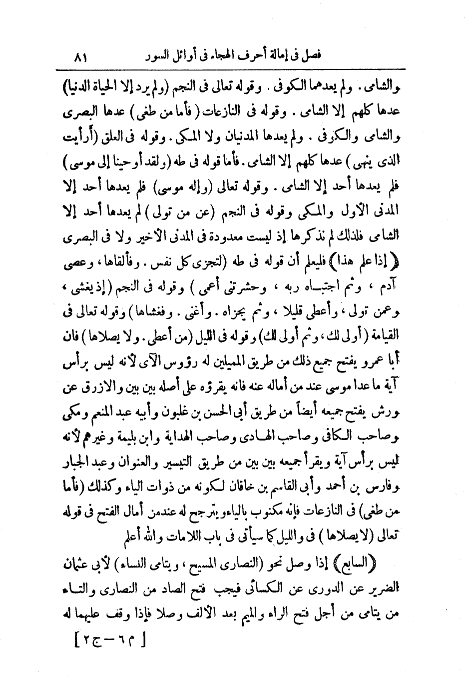 وَالشَّامِيُّ. وَلَمْ يَعُدُّهُمَا الْكُوفِيُّ. وَقَوْلُهُ تَعَالَى: فِي النَّجْمِ وَلَمْ يُرِدْ إِلَّا الْحَيَاةَ الدُّنْيَا عَدَّهَا كُلُّهُمْ إِلَّا الشَّامِيَّ وَقَوْلُهُ فِي النَّازِعَاتِ فَأَمَّا مَنْ طَغَى عَدَّهَا الْبَصَرِيُّ، وَالشَّامِيُّ، وَالْكُوفِيُّ، وَلَمْ يَعُدَّهَا الْمَدَنِيَّانِ، وَلَا الْمَكِّيُّ. وَقَوْلُهُ فِي الْعَلَقِ أَرَأَيْتَ الَّذِي يَنْهَى عَدَّهَا كُلُّهُمْ إِلَّا الشَّامِيَّ. فَأَمَّا قَوْلُهُ فِي طه وَلَقَدْ أَوْحَيْنَا إِلَى مُوسَى فَلَمْ يَعُدَّهَا أَحَدٌ إِلَّا الشَّامِيُّ. وَقَوْلُهُ تَعَالَى: وَإِلَهُ مُوسَى فَلَمْ يَعُدَّهَا أَحَدٌ إِلَّا الْمَدَنِيُّ الْأَوَّلُ، وَالْمَكِّيُّ وَقَوْلُهُ فِي النَّجْمِ عَنْ مَنْ تَوَلَّى لَمْ يَعُدَّهَا أَحَدٌ إِلَّا الشَّامِيُّ فَلِذَلِكَ لَمْ نَذْكُرْهَا إِذْ لَيْسَتْ مَعْدُودَةً فِي الْمَدَنِيِّ الْأَخِيرِ، وَلَا فِي الْبَصْرِيِّ إِذَا عُلِمَ هَذَا فَلْيُعْلَمْ أَنَّ قَوْلَهُ فِي طه لِتُجْزَى كُلُّ نَفْسٍ. فَأَلْقَاهَا، عَصَى آدَمُ، ثُمَّ اجْتَبَاهُ رَبُّهُ، حَشَرْتَنِي أَعْمَى وَقَوْلُهُ فِي النَّجْمِ إِذْ يَغْشَى، عَمَّنْ تَوَلَّى، أَعْطَى قَلِيلًا، ثُمَّ يُجْزَاهُ. أَغْنَى. فَغَشَّاهَا وَقَوْلُهُ تَعَالَى: فِي الْقِيَامَةِ أَوْلَى لَكَ، ثُمَّ أَوْلَى لَكَ وَقَوْلُهُ فِي اللَّيْلِ مَنْ أَعْطَى. لَا يَصْلَاهَا فَإِنَّ أَبَا عَمْرٍو يَفْتَحُ جَمِيعَ ذَلِكَ مِنْ طَرِيقِ الْمُمِيلِينَ لَهُ رُءُوسَ الْآيِ لِأَنَّهُ لَيْسَ بِرَأْسِ آيَةٍ مَا عَدَا مُوسَى عِنْدَ مَنْ أَمَالَهُ عِنْدَ مَنْ أَمَالَهُ عَنْهُ فَإِنَّهُ يَقْرَؤُهُ عَلَى أَصْلِهِ بَيْنَ بَيْنَ وَالْأَزْرَقُ عَنْ وَرْشٍ يَفْتَحُ جَمِيعَهُ أَيْضًا مِنْ طَرِيقِ أَبِي الْحَسَنِ بْنِ غَلْبُونَ، وَأَبِيهِ عَبْدِ الْمُنْعِمِ وَمَكِّيٍّ، وَصَاحِبِ الْكَافِي، وَصَاحِبِ الْهَادِي، وَصَاحِبِ الْهِدَايَةِ، وَابْنِ بَلِّيمَةَ، وَغَيْرِهِمْ لِأَنَّهُ لَيْسَ بِرَأْسِ آيَةٍ وَيَقْرَأُ جَمِيعَهُ بَيْنَ بَيْنَ مِنْ طَرِيقِ التَّيْسِيرِ، وَالْعُنْوَانِ، وَعَبْدِ الْجَبَّارِ وَفَارِسِ بْنِ أَحْمَدَ وَأَبِي الْقَاسِمِ بْنِ خَاقَانِ لِكَوْنِهِ مِنْ ذَوَاتِ الْيَاءِ، وَكَذَلِكَ فَأَمَّا مَنْ طَغَى فِي النَّازِعَاتِ فَإِنَّهُ مَكْتُوبٌ بِالْيَاءِ وَيَتَرَجَّحُ لَهُ عِنْدَ مَنْ أَمَالَ الْفَتْحَ فِي قَوْلِهِ تَعَالَى: لَا يَصْلَاهَا فِي وَاللَّيْلِ كَمَا سَيَأْتِي فِي بَابِ اللَّامَاتِ - وَاللَّهُ أَعْلَمُ -.
