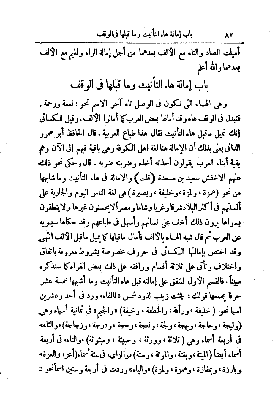 وَهِيَ الْهَاءُ الَّتِي تَكُونُ فِي الْوَصْلِ تَاءً آخِرَ الِاسْمِ نَحْوَ: نِعْمَةٍ وَرَحْمَةٍ فَتُبْدَلُ فِي الْوَقْفِ هَاءً، وَقَدْ أَمَالَهَا بَعْضُ الْعَرَبِ كَمَا أَمَالُوا الْأَلِفَ. وَقِيلَ لِلْكِسَائِيِّ إِنَّكَ تُمِيلُ مَا قَبْلَ هَاءِ التَّأْنِيثِ فَقَالَ: هَذَا طِبَاعُ الْعَرَبِيَّةِ. قَالَ الْحَافِظُ أَبُو عَمْرٍو الدَّانِيُّ يَعْنِي بِذَلِكَ أَنَّ الْإِمَالَةَ هُنَا لُغَةُ أَهْلِ الْكُوفَةِ، وَهِيَ بَاقِيَةٌ فِيهِمْ إِلَى الْآنِ وَهُمْ بَقِيَّةُ أَبْنَاءِ الْعَرَبِ يَقُولُونَ أَخَذْتُهُ أَخْذَةً وَضَرَبْتُهُ ضَرْبَةً. قَالَ: وَحَكَى نَحْوَ ذَلِكَ عَنْهُمُ الْأَخْفَشُ سَعِيدُ بْنُ مَسْعَدَةَ.