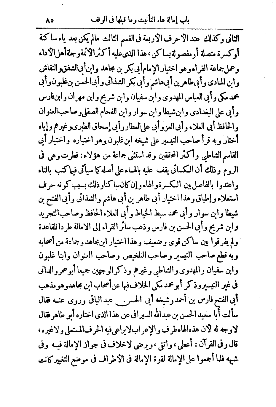 الثَّانِي، وَكَذَلِكَ عِنْدَ الْأَحْرُفِ الْأَرْبَعَةِ فِي الْقِسْمِ الثَّالِثِ مَا لَمْ يَكُنْ بَعْدَ يَاءٍ سَاكِنَةٍ، أَوْ كَسْرَةٍ مُتَّصِلَةٍ، أَوْ مَفْصُولَةٍ بِسَاكِنٍ، هَذَا الَّذِي عَلَيْهِ أَكْثَرُ الْأَئِمَّةِ وَجُلَّةُ أَهْلِ الْأَدَاءِ وَعَمَلُ جَمَاعَةِ الْقُرَّاءِ، وَهُوَ اخْتِيَارُ الْإِمَامِ أَبِي بَكْرِ بْنِ مُجَاهِدٍ وَابْنِ أَبِي الشَّفَقِ وَالنَّقَّاشِ وَابْنِ الْمُنَادِي، وَأَبِي طَاهِرِ بْنِ أَبِي هَاشِمٍ، وَأَبِي بَكْرِ الشَّذَائِيِّ وَأَبِي الْحَسَنِ بْنِ غَلْبُونَ وَأَبِي مُحَمَّدٍ مَكِّيٍّ وَأَبِي الْعَبَّاسِ الْمَهْدَوِيِّ وَابْنِ سُفْيَانَ وَابْنِ شُرَيْحٍ وَابْنِ مِهْرَانَ وَابْنِ فَارِسٍ وَأَبِي عَلِيٍّ الْبَغْدَادِيِّ وَابْنِ شَيْطٍ وَابْنِ سَوَّارٍ وَابْنِ الْفَحَّامِ الصِّقِلِّيِّ، وَصَاحِبِ الْعُنْوَانِ، وَالْحَافِظِ أَبِي الْعَلَاءِ وَأَبِي الْعِزِّ وَأَبِي عَلِيٍّ الْبَيْطَارِ وَأَبِي إِسْحَاقٍ الطَّبَرِيِّ، وَغَيْرِهِمْ وَإِيَّاهُ أَخْتَارُ، وَبِهِ قَرَأَ صَاحِبُ التَّيْسِيرِ، عَلَى شَيْخِهِ ابْنِ غَلْبُونَ، وَهُوَ اخْتِيَارُهُ، وَاخْتِيَارُ أَبِي الْقَاسِمِ الشَّاطِبِيِّ، وَأَكْثَرُ الْمُحَقِّقِينَ، وَقَدِ اسْتَثْنَى جَمَاعَةٌ مِنْ هَؤُلَاءِ: فِطْرَةَ وَهِيَ فِي الرَّوْمِ، وَذَلِكَ أَنَّ الْكِسَائِيَّ يَقِفُ عَلَيْهِ بِالْهَاءِ عَلَى أَصْلِهِ كَمَا سَيَأْتِي فِيمَا كُتِبَ بِالتَّاءِ، وَاعْتَدُّوا بِالْفَاصِلِ بَيْنَ الْكَسْرَةِ وَالْهَاءِ وَإِنْ كَانَ سَاكِنًا، وَذَلِكَ بِسَبَبِ كَوْنِهِ حَرْفَ اسْتِعْلَاءٍ وَإِطْبَاقٍ، وَهَذَا اخْتِيَارُ أَبِي طَاهِرِ بْنِ أَبِي هَاشِمٍ وَالشَّذَائِيِّ وَأَبِي الْفَتْحِ بْنِ شَيْطٍ وَابْنِ سَوَّارٍ وَأَبِي مُحَمَّدٍ سِبْطِ الْخَيَّاطِ وَأَبِي الْعَلَاءِ الْحَافِظِ، وَصَاحِبِ التَّجْرِيدِ، وَابْنِ شُرَيْحٍ وَأَبِي الْحَسَنِ بْنِ فَارِسٍ، وَذَهَبَ سَائِرُ الْقُرَّاءِ إِلَى الْإِمَالَةِ طَرْدًا لِلْقَاعِدَةِ، وَلَمْ يُفَرِّقُوا بَيْنَ سَاكِنٍ قَوِيٍّ وَضَعِيفٍ، وَهَذَا اخْتِيَارُ ابْنِ مُجَاهِدٍ وَجَمَاعَةٍ مِنْ أَصْحَابِهِ، وَبِهِ قَطَعَ صَاحِبُ التَّيْسِيرِ، وَصَاحِبُ التَّلْخِيصِ، وَصَاحِبُ الْعُنْوَانِ، وَابْنُ غَلْبُونَ وَابْنُ سُفْيَانَ وَالْمَهْدَوِيُّ وَالشَّاطِبِيُّ، وَغَيْرُهُمْ، وَذَكَرَ الْوَجْهَيْنِ جَمِيعًا أَبُو عَمْرٍو الدَّانِيُّ فِي غَيْرِ التَّيْسِيرِ، وَذَكَرَ أَبُو مُحَمَّدٍ مَكِّيٌّ الْخِلَافَ فِيهَا عَنْ أَصْحَابِ ابْنِ مُجَاهِدٍ، وَهُوَ مَذْهَبُ أَبِي الْفَتْحِ فَارِسِ بْنِ أَحْمَدَ وَشَيْخِ أَبِي الْحَسَنِ عَبْدِ الْبَاقِي، وَرَوَى عَنْهُ فَقَالَ: سَأَلْتُ أَبَا سَعِيدٍ الْحَسَنَ بْنَ عَبْدِ اللَّهِ السِّيرَافِيَّ عَنْ هَذَا الَّذِي اخْتَارَهُ أَبُو طَاهِرٍ فَقَالَ: لَا وَجْهَ لَهُ لِأَنَّ هَذِهِ الْهَاءَ طَرَفٌ وَالْإِعْرَابُ لَا يُرَاعَى فِيهِ الْحَرْفُ الْمُسْتَعْلَى، وَلَا غَيْرُهُ، قَالَ: وَفِي الْقُرْآنِ: أَعْطَى، وَاتَّقَى، وَيَرْضَى لَا خِلَافَ فِي جَوَازِ الْإِمَالَةِ فِيهِ، وَفِي شِبْهِهِ فَلَمَّا أَجْمَعُوا عَلَى الْإِمَالَةِ لِقُوَّةِ الْإِمَالَةِ فِي الْأَطْرَافِ فِي مَوْضِعِ التَّغْيِيرِ