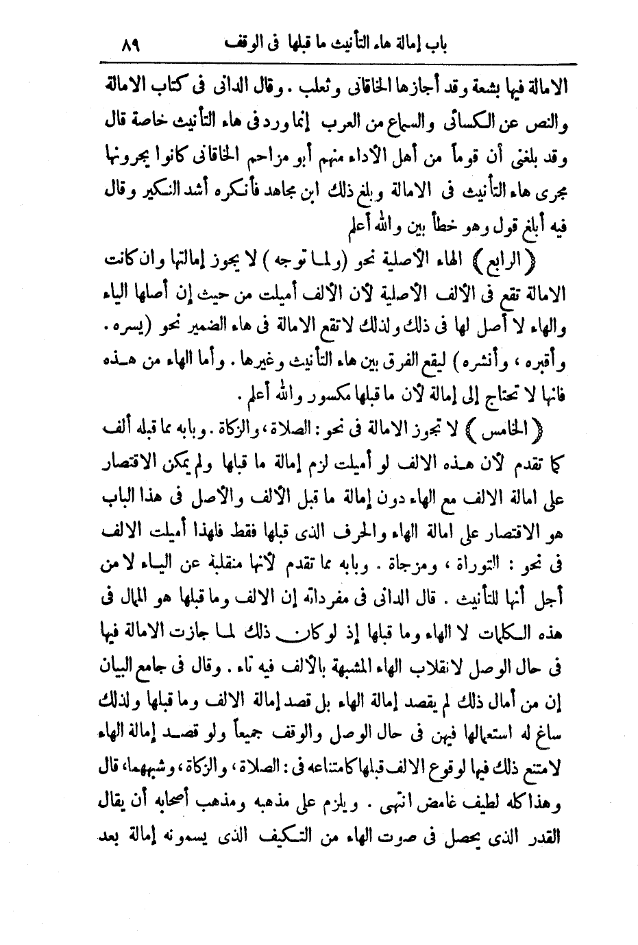 (الْخَامِسُ) لَا تَجُوزُ الْإِمَالَةُ فِي نَحْوِ: الصَّلَاةِ، وَالزَّكَاةِ. وَبَابُهُ مِمَّا قَبْلَهُ أَلِفٌ كَمَا تَقَدَّمَ لِأَنَّ هَذِهِ الْأَلِفَ لَوْ أُمِيلَتْ لَزِمَ إِمَالَةُ مَا قَبْلَهَا، وَلَمْ يُمْكِنِ الِاقْتِصَارُ عَلَى إِمَالَةِ الْأَلِفِ مَعَ الْهَاءِ دُونَ إِمَالَةِ مَا قَبْلَ الْأَلِفِ وَالْأَصْلُ فِي هَذَا الْبَابِ هُوَ الِاقْتِصَارُ عَلَى إِمَالَةِ الْهَاءِ وَالْحَرْفِ الَّذِي قَبْلَهَا فَقَطْ، فَلِهَذَا أُمِيلَتِ الْأَلِفُ فِي نَحْوِ: التَّوْرَاةُ، وَمُزْجَاةٍ. وَبَابُهُ مِمَّا تَقَدَّمَ، لِأَنَّهَا مُنْقَلِبَةٌ عَنِ الْيَاءِ لَا مِنْ أَجْلِ أَنَّهَا لِلتَّأْنِيثِ.