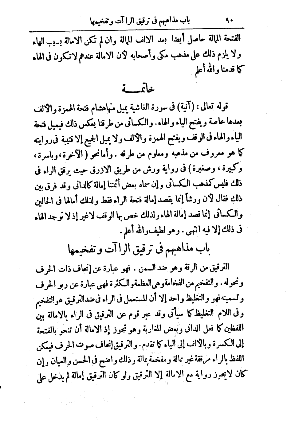 وَالتَّرْقِيقُ إِنْحَافُ صَوْتِ الْحَرْفِ فَيُمْكِنُ اللَّفْظُ بِالرَّاءِ مُرَقَّقَةً غَيْرَ مُمَالَةٍ وَمُفَخَّمَةً مُمَالَةً، وَذَلِكَ وَاضِحٌ فِي الْحُسْنِ وَالْعِيَانِ وَإِنْ كَانَ لَا يَجُوزُ رِوَايَةً مَعَ الْإِمَالَةِ إِلَّا التَّرْقِيقُ، وَلَوْ كَانَ التَّرْقِيقُ إِمَالَةً لَمْ يَدْخُلْ عَلَى
