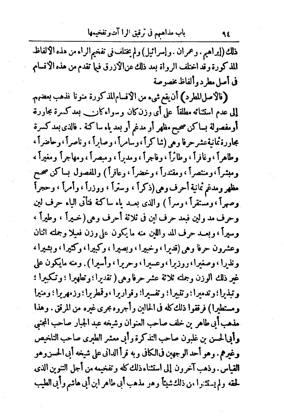 ذَلِكَ إِبْرَاهِيمَ. وَعِمْرَانَ. وَإِسْرَائِيلَ، وَلَمْ يَخْتَلِفْ فِي تَفْخِيمِ الرَّاءِ مِنْ هَذِهِ الْأَلْفَاظِ الْمَذْكُورَةِ، وَقَدِ اخْتَلَفَ الرُّوَاةُ بَعْدَ ذَلِكَ عَنِ الْأَزْرَقِ فِيمَا تَقَدَّمَ مِنْ هَذِهِ الْأَقْسَامِ فِي أَصْلٍ مُطَّرِدٍ وَأَلْفَاظٍ مَخْصُوصَةٍ.