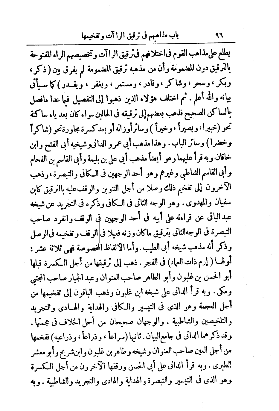 يَطَّلِعُ عَلَى مَذَاهِبِ الْقَوْمِ فِي اخْتِلَافِهِمْ فِي تَرْقِيقِ الرَّاءَاتِ وَتَخْصِيصِهِمُ الرَّاءَ الْمَفْتُوحَةَ بِالتَّرْقِيقِ دُونَ الْمَضْمُومَةِ وَأَنَّ مَنْ مَذْهَبُهُ تَرْقِيقُ الْمَضْمُومَةِ لَمْ يُفَرِّقْ بَيْنَ ذِكْرُ، وَبِكْرٌ، وَسِحْرٌ، وَشَاكِرٌ، وَقَادِرٌ، وَمُسْتَمِرٌّ، وَيَغْفِرُ، وَيَقْدِرُ كَمَا سَيَأْتِي بَيَانُهُ - وَاللَّهُ أَعْلَمُ -.