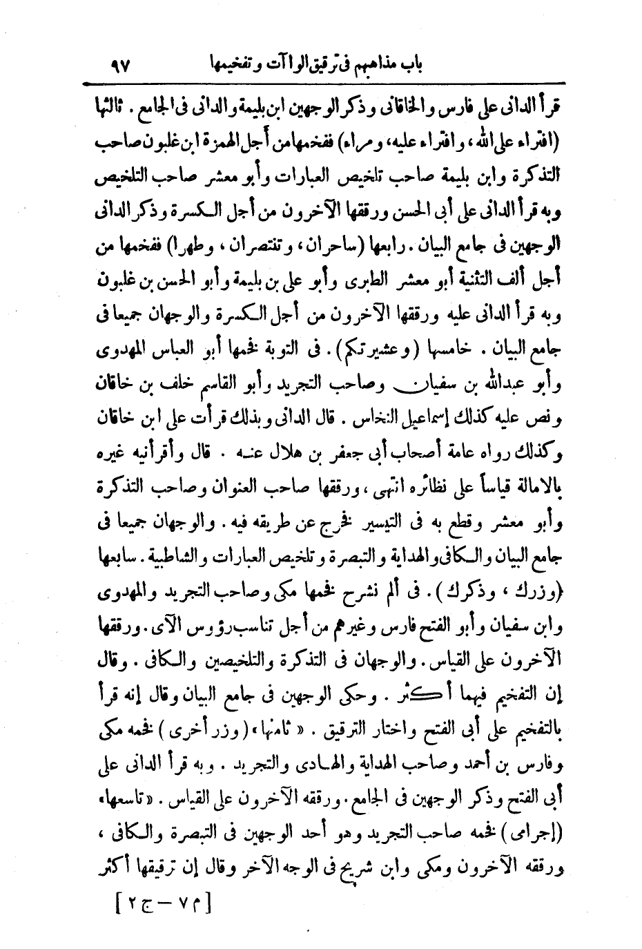 رَابِعُهَا لَسَاحِرَانِ، وَتَنْتَصِرَانِ، وَطَهِّرَا فَفَخَّمَهَا مِنْ أَجْلِ أَلِفِ التَّثْنِيَةِ أَبُو مَعْشَرٍ الطَّبَرِيُّ وَأَبُو عَلِيِّ بْنُ بَلِّيمَةَ، وَأَبُو الْحَسَنِ بْنُ غَلْبُونَ، وَبِهِ قَرَأَ الدَّانِيُّ عَلَيْهِ وَرَقَّقَهَا الْآخَرُونَ مِنْ أَجْلِ الْكَسْرَةِ، وَالْوَجْهَانِ جَمِيعًا فِي جَامِعِ الْبَيَانِ. خَامِسُهَا وَعَشِيرَتُكُمْ فِي التَّوْبَةِ فَخَّمَهَا أَبُو الْعَبَّاسِ الْمَهْدَوِيُّ، وَأَبُو عَبْدِ اللَّهِ بْنُ سُفْيَانَ، وَصَاحِبُ التَّجْرِيدِ، وَأَبُو الْقَاسِمِ خَلَفُ بْنُ خَاقَانَ، وَنَصَّ عَلَيْهِ كَذَلِكَ إِسْمَاعِيلُ النَّخَّاسُ. قَالَ: الدَّانِيُّ، وَبِذَلِكَ قَرَأْتُ عَلَى ابْنِ خَاقَانَ، وَكَذَلِكَ رَوَاهُ عَامَّةُ أَصْحَابِ أَبِي جَعْفَرِ بْنِ هِلَالٍ عَنْهُ.
