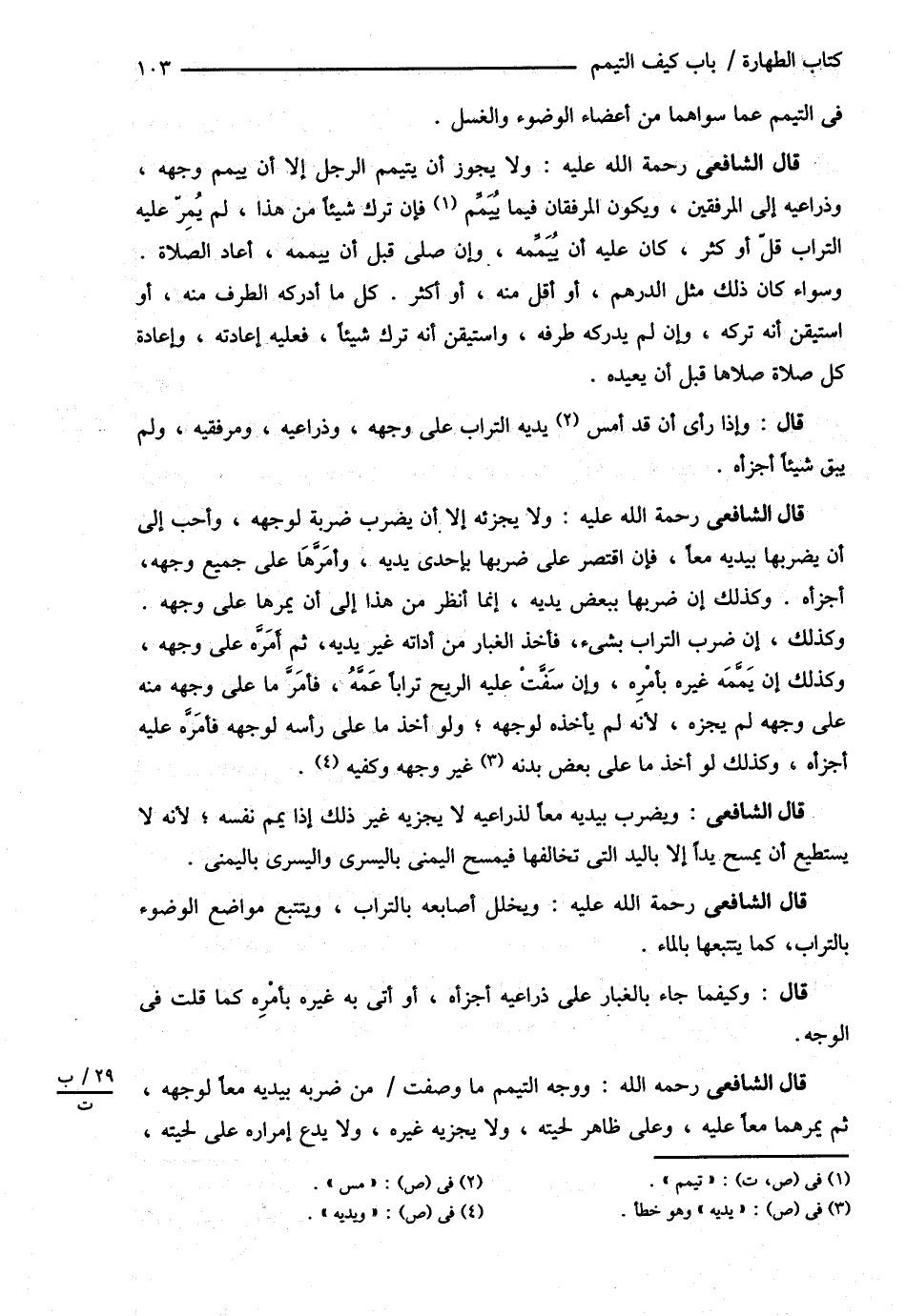 قَالَ الشَّافِعِيُّ : وَلاَ يَجُوزُ أَنْ يَتَيَمَّمَ الرَّجُلُ إلَّا أَنْ يُيَمِّمَ وَجْهَهُ وَذِرَاعَيْهِ إلَى الْمِرْفَقَيْنِ وَيَكُونُ الْمِرْفَقَانِ فِيمَا يُيَمِّمُ فَإِنْ تَرَكَ شَيْئًا مِنْ هَذَا لَمْ يُمِرَّ عَلَيْهِ التُّرَابَ قَلَّ أَوْ كَثُرَ كَانَ عَلَيْهِ أَنْ يُيَمِّمَهُ وَإِنْ صَلَّى قَبْلَ أَنْ يُيَمِّمَهُ أَعَادَ الصَّلاَةَ وَسَوَاءٌ كَانَ ذَلِكَ مِثْلَ الدِّرْهَمِ أَوْ أَقَلَّ مِنْهُ أَوْ أَكْثَرَ كُلُّ مَا أَدْرَكَهُ الطَّرَفُ مِنْهُ أَوْ اسْتَيْقَنَ أَنَّهُ تَرَكَهُ وَإِنْ لَمْ يُدْرِكْهُ طَرَفُهُ وَاسْتَيْقَنَ أَنَّهُ تَرَكَ شَيْئًا فَعَلَيْهِ إعَادَتُهُ وَإِعَادَةُ كُلِّ صَلاَةٍ صَلَّاهَا قَبْلَ أَنْ يُعِيدَهُ.
