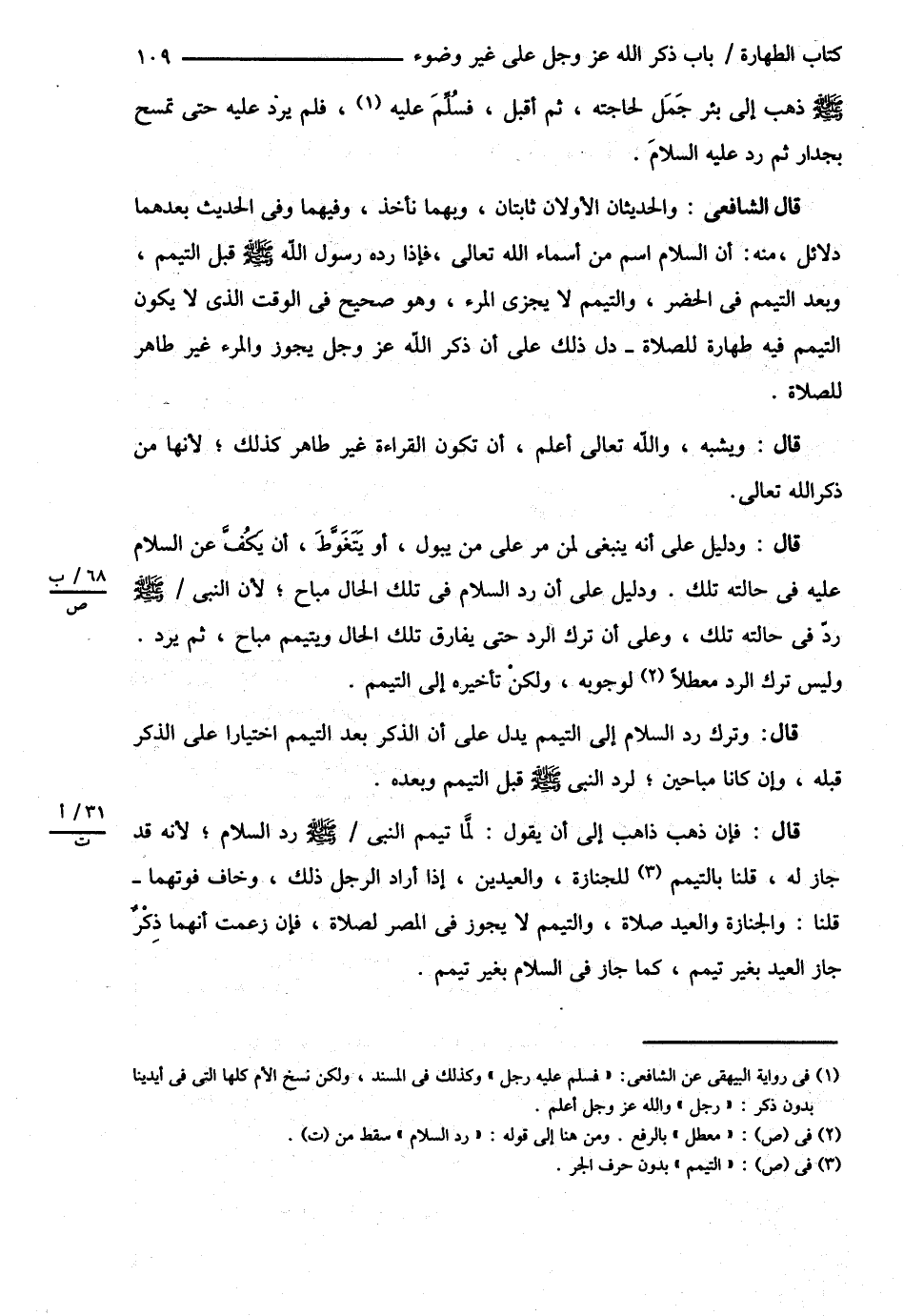 قَالَ الشَّافِعِيُّ : وَالْحَدِيثَانِ الْأَوَّلاَنِ ثَابِتَانِ , وَبِهِمَا نَأْخُذُ وَفِيهِمَا وَفِي الْحَدِيثِ بَعْدَهُمَا دَلاَئِلُ مِنْهُ أَنَّ السَّلاَمَ اسْمٌ مِنْ أَسْمَاءِ اللَّهِ تَعَالَى فَإِذَا رَدَّهُ رَسُولُ اللَّهِ - صلى الله عليه وسلم - قَبْلَ التَّيَمُّمِ وَبَعْدَ التَّيَمُّمِ فِي الْحَضَرِ وَالتَّيَمُّمِ لاَ يُجْزِي الْمَرْءَ وَهُوَ صَحِيحٌ فِي الْوَقْتِ الَّذِي لاَ يَكُونُ التَّيَمُّمُ فِيهِ طَهَارَةً لِلصَّلاَةِ دَلَّ ذَلِكَ عَلَى أَنَّ ذِكْرَ اللَّهِ عَزَّ وَجَلَّ يَجُوزُ وَالْمَرْءُ غَيْرُ طَاهِرٍ لِلصَّلاَةِ.