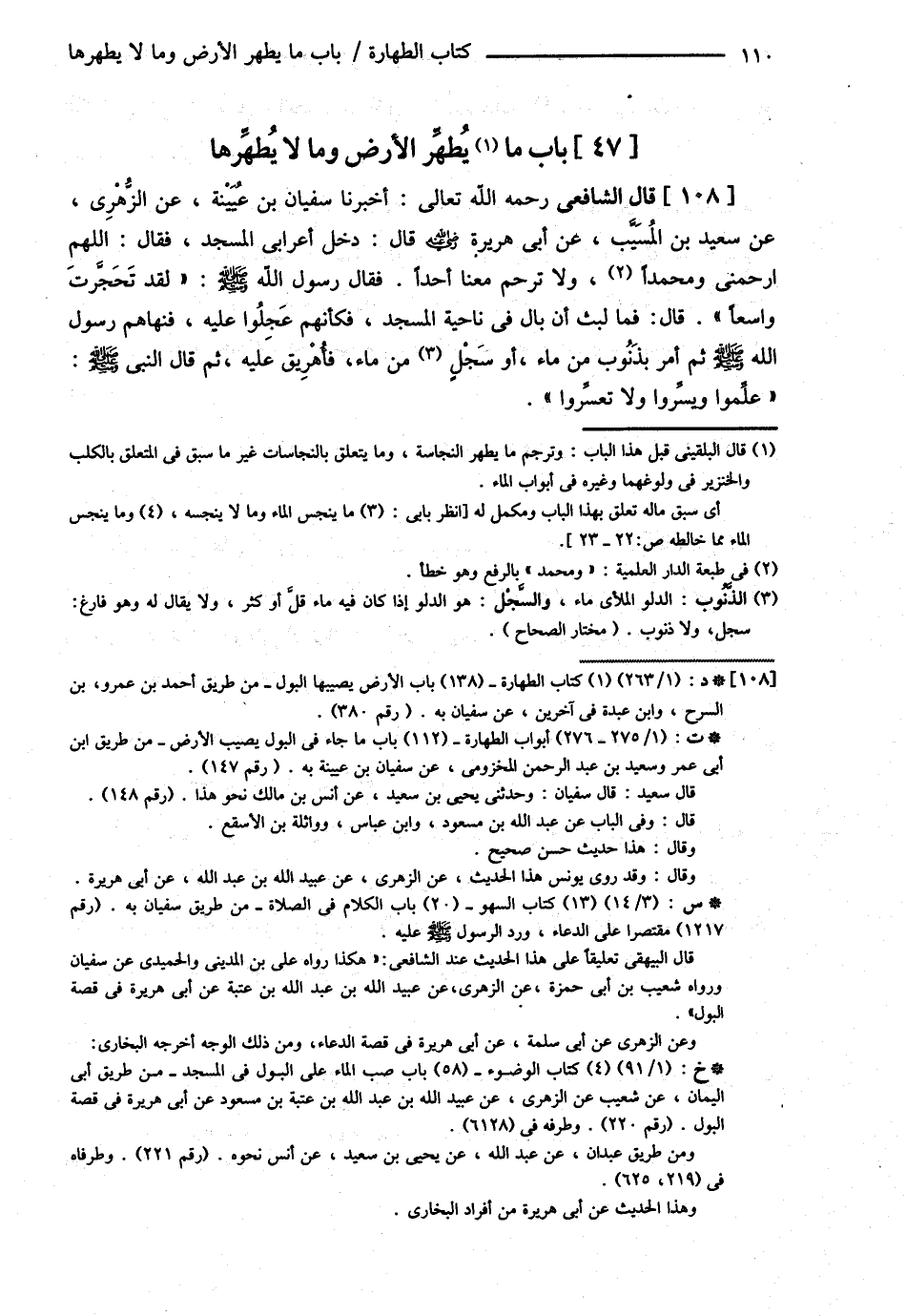 قَالَ الشَّافِعِيُّ : رحمه الله تعالى أَخْبَرَنَا سُفْيَانُ بْنُ عُيَيْنَةَ عَنْ الزُّهْرِيِّ عَنْ سَعِيدِ بْنِ الْمُسَيِّبِ عَنْ أَبِي هُرَيْرَةَ رضي الله تعالى عنه قَالَ { دَخَلَ أَعْرَابِيٌّ الْمَسْجِدَ فَقَالَ اللَّهُمَّ ارْحَمْنِي وَمُحَمَّدًا وَلاَ تَرْحَمْ مَعَنَا أَحَدًا فَقَالَ رَسُولُ اللَّهِ - صلى الله عليه وسلم - لَقَدْ تَحَجَّرْت وَاسِعًا قَالَ فَمَا لَبِثَ أَنْ بَالَ فِي نَاحِيَةِ الْمَسْجِدِ فَكَأَنَّهُمْ عَجَّلُوا عَلَيْهِ فَنَهَاهُمْ رَسُولُ اللَّهِ - صلى الله عليه وسلم - ثُمَّ أَمَرَ بِذَنُوبٍ مِنْ مَاءٍ أَوْ سَجْلٍ مِنْ مَاءٍ فَأُهْرِيقَ عَلَيْهِ ثُمَّ قَالَ النَّبِيُّ - صلى الله عليه وسلم - عَلِّمُوا وَيَسِّرُوا وَلاَ تُعَسِّرُوا ?@