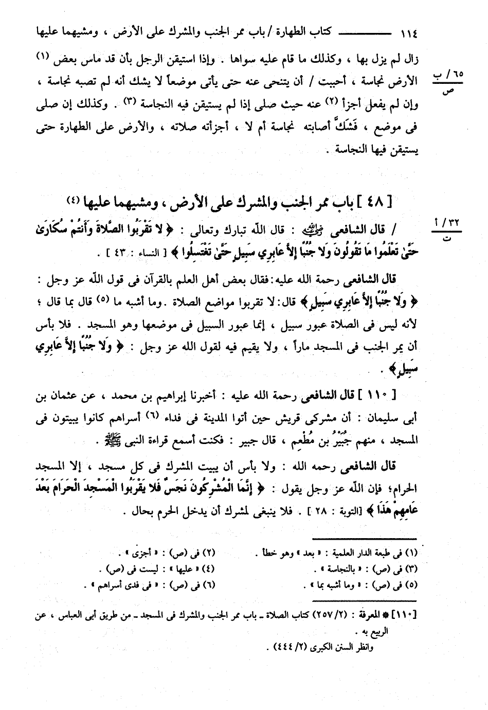 قَالَ الشَّافِعِيُّ : أَخْبَرَنَا إبْرَاهِيمُ بْنُ مُحَمَّدٍ عَنْ عُثْمَانَ بْنِ أَبِي سُلَيْمَانَ أَنَّ مُشْرِكِي قُرَيْشٍ حِينَ أَتَوْا الْمَدِينَةَ فِي فِدَاءِ أَسْرَاهُمْ كَانُوا يَبِيتُونَ فِي الْمَسْجِدِ . مِنْهُمْ جُبَيْرُ بْنُ مُطْعِمٍ , قَالَ جُبَيْرٌ : فَكُنْت أَسْمَعُ قِرَاءَةَ النَّبِيِّ - صلى الله عليه وسلم -