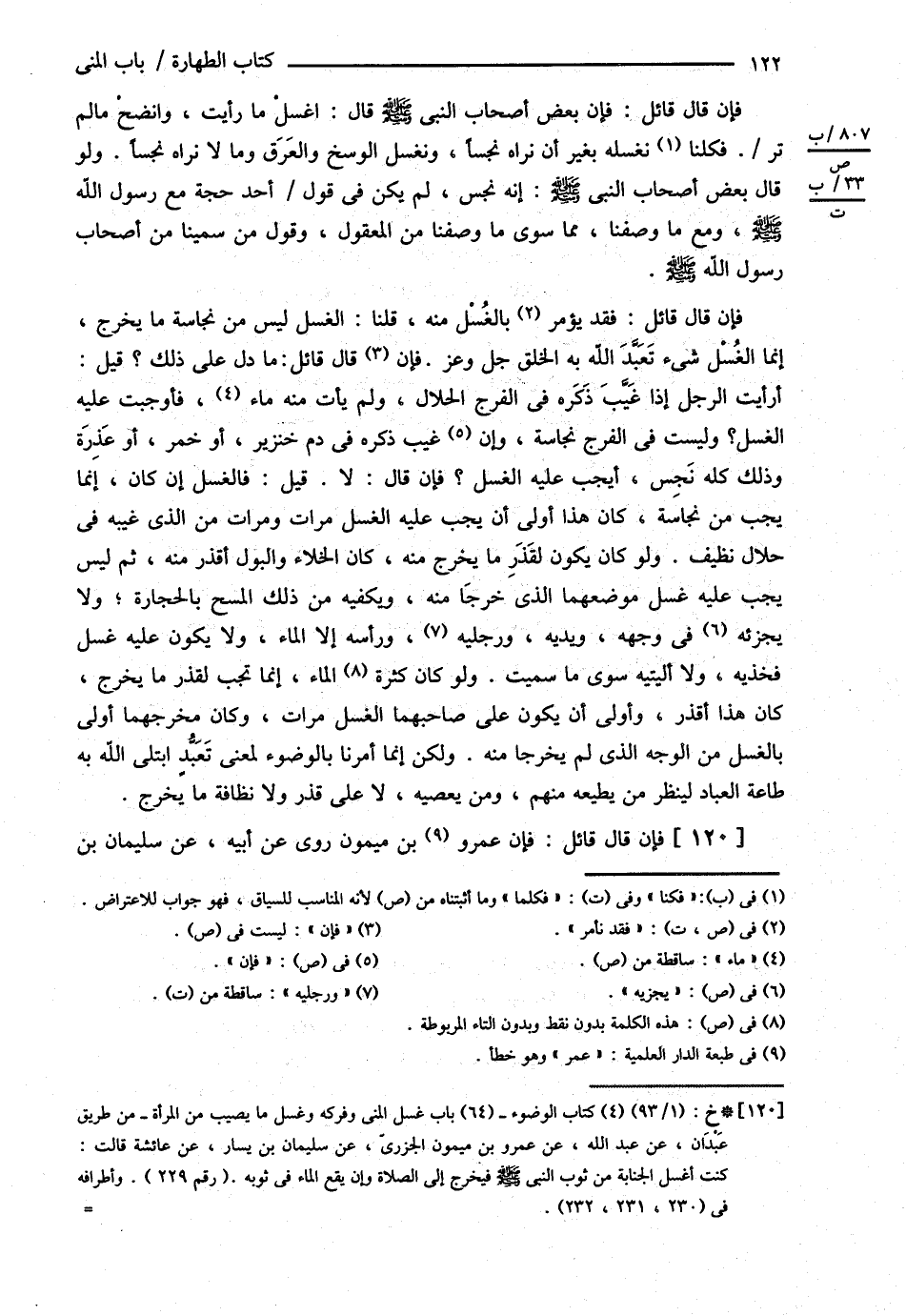 فَإِنْ قَالَ قَائِلٌ فَإِنَّ بَعْضَ أَصْحَابِ النَّبِيِّ - صلى الله عليه وسلم - قَالَ : اغْسِلْ مَا رَأَيْت وَانْضَحْ مَا لَمْ تَرَ فَكُنَّا نَغْسِلُهُ بِغَيْرِ أَنْ نَرَاهُ نَجِسًا وَنَغْسِلُ الْوَسَخَ وَالْعَرَقَ وَمَا لاَ نَرَاهُ نَجِسًا وَلَوْ قَالَ بَعْضُ أَصْحَابِ النَّبِيِّ - صلى الله عليه وسلم - : إنَّهُ نَجِسٌ لَمْ يَكُنْ فِي قَوْلِ أَحَدٍ حُجَّةٌ مَعَ رَسُولِ اللَّهِ - صلى الله عليه وسلم - وَمَعَ مَا وَصَفْنَا مِمَّا سِوَى مَا وَصَفْنَا مِنْ الْمَعْقُولِ وَقَوْلِ مَنْ سَمَّيْنَا مِنْ أَصْحَابِ رَسُولِ اللَّهِ - صلى الله عليه وسلم - فَإِنْ قَالَ قَائِلٌ فَقَدْ يُؤْمَرُ بِالْغُسْلِ مِنْهُ قُلْنَا : الْغُسْلُ لَيْسَ مِنْ نَجَاسَةِ مَا يَخْرُجُ إنَّمَا الْغُسْلُ شَيْءٌ تَعَبَّدَ اللَّهُ بِهِ الْخَلْقَ - عَزَّ وَجَلَّ - فَإِنْ قَالَ قَائِلٌ مَا دَلَّ عَلَى ذَلِكَ ؟ قِيلَ أَرَأَيْت الرَّجُلَ إذَا غَيَّبَ ذَكَرَهُ فِي الْفَرْجِ الْحَلاَلِ وَلَمْ يَأْتِ مِنْهُ مَاءٌ فَأَوْجَبْت عَلَيْهِ الْغُسْلَ , وَلَيْسَتْ فِي الْفَرْجِ نَجَاسَةٌ وَإِنْ غَيَّبَ ذَكَرَهُ فِي دَمِ خِنْزِيرٍ , أَوْ خَمْرٍ , أَوْ عَذِرَةٍ وَذَلِكَ كُلُّهُ نَجِسٌ أَيَجِبُ عَلَيْهِ الْغُسْلُ ؟ فَإِنْ قَالَ : لاَ قِيلَ : فَالْغُسْلُ إنْ كَانَ إنَّمَا يَجِبُ مِنْ نَجَاسَةٍ كَانَ هَذَا أَوْلَى أَنْ يَجِبَ عَلَيْهِ الْغُسْلُ مَرَّاتٍ وَمَرَّاتٍ مِنْ الَّذِي غَيَّبَهُ فِي حَلاَلٍ نَظِيفٍ وَلَوْ كَانَ يَكُونُ لِقَذَرِ مَا يَخْرُجُ مِنْهُ كَانَ الْخَلاَءُ وَالْبَوْلُ أَقْذَرَ مِنْهُ ثُمَّ لَيْسَ يَجِبُ عَلَيْهِ غُسْلُ مَوْضِعِهِمَا الَّذِي خَرَجَا مِنْهُ وَيَكْفِيهِ مِنْ ذَلِكَ الْمَسْحُ بِالْحِجَارَةِ وَلاَ يُجْزِئُهُ فِي وَجْهِهِ وَيَدَيْهِ وَرِجْلَيْهِ وَرَأْسِهِ إلَّا الْمَاءُ وَلاَ يَكُونُ عَلَيْهِ غَسْلُ فَخِذَيْهِ وَلاَ أَلْيَتَيْهِ سِوَى مَا سَمَّيْت وَلَوْ كَانَ كَثْرَةُ الْمَاءِ إنَّمَا تَجِبُ لِقَذَرِ مَا يَخْرُجُ كَانَ هَذَانِ أَقْذَرَ وَأَوْلَى أَنْ يَكُونَ عَلَى صَاحِبِهِمَا الْغُسْلُ مَرَّاتٍ وَكَانَ مَخْرَجُهُمَا أَوْلَى بِالْغُسْلِ مِنْ الْوَجْهِ الَّذِي لَمْ يَخْرُجَا مِنْهُ وَلَكِنْ إنَّمَا أُمِرْنَا بِالْوُضُوءِ لِمَعْنَى تَعَبُّدٍ ابْتَلَى اللَّهُ بِهِ طَاعَةَ الْعِبَادِ لِيَنْظُرَ مَنْ يُطِيعُهُ مِنْهُمْ وَمَنْ يَعْصِيهِ لاَ عَلَى قَذَرِ وَلاَ نَظَافَةِ مَا يَخْرُجُ فَإِنْ قَالَ قَائِلٌ فَإِنَّ عَمْرَو بْنَ مَيْمُونٍ رَوَى عَنْ أَبِيهِ عَنْ سُلَيْمَانَ بْنِ@