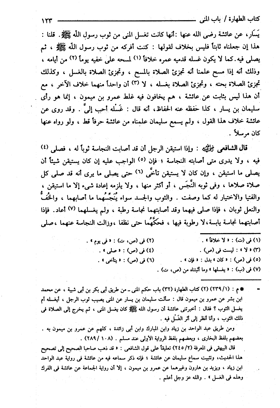 يَسَارٍ { عَنْ عَائِشَةَ أَنَّهَا كَانَتْ تَغْسِلُ الْمَنِيَّ مِنْ ثَوْبِ رَسُولِ اللَّهِ - صلى الله عليه وسلم - ? قُلْنَا : هَذَا إنْ جَعَلْنَاهُ ثَابِتًا فَلَيْسَ بِخِلاَفٍ لِقَوْلِهَا كُنْت أَفْرُكُهُ مِنْ ثَوْبِ رَسُولِ اللَّهِ - صلى الله عليه وسلم - ثُمَّ يُصَلِّي فِيهِ كَمَا لاَ يَكُونُ غُسْلُهُ قَدَمَيْهِ عُمْرَهُ خِلاَفًا لِمَسْحِهِ عَلَى خُفَّيْهِ يَوْمًا مِنْ أَيَّامِهِ وَذَلِكَ أَنَّهُ إذَا مَسَحَ عَلِمْنَا أَنَّهُ تُجْزِئُ الصَّلاَةُ بِالْمَسْحِ وَتُجْزِئُ الصَّلاَةُ بِالْغُسْلِ وَكَذَلِكَ تُجْزِئُ الصَّلاَةُ بِحَتِّهِ وَتُجْزِئُ الصَّلاَةُ بِغُسْلِهِ لاَ أَنَّ وَاحِدًا مِنْهُمَا خِلاَفُ الْآخَرِ مَعَ أَنَّ هَذَا لَيْسَ بِثَابِتٍ عَنْ عَائِشَةَ هُمْ يَخَافُونَ فِيهِ غَلَطَ عَمْرِو بْنِ مَيْمُونٍ إنَّمَا هُوَ رَأْيُ سُلَيْمَانَ بْنِ يَسَارٍ كَذَا حَفِظَهُ عَنْهُ الْحُفَّاظُ أَنَّهُ قَالَ غُسْلُهُ أَحَبُّ إلَيَّ وَقَدْ رُوِيَ عَنْ عَائِشَةَ خِلاَفُ هَذَا الْقَوْلِ وَلَمْ يَسْمَعْ سُلَيْمَانُ عَلِمْنَاهُ مِنْ عَائِشَةَ حَرْفًا قَطُّ وَلَوْ رَوَاهُ عَنْهَا كَانَ مُرْسَلاً