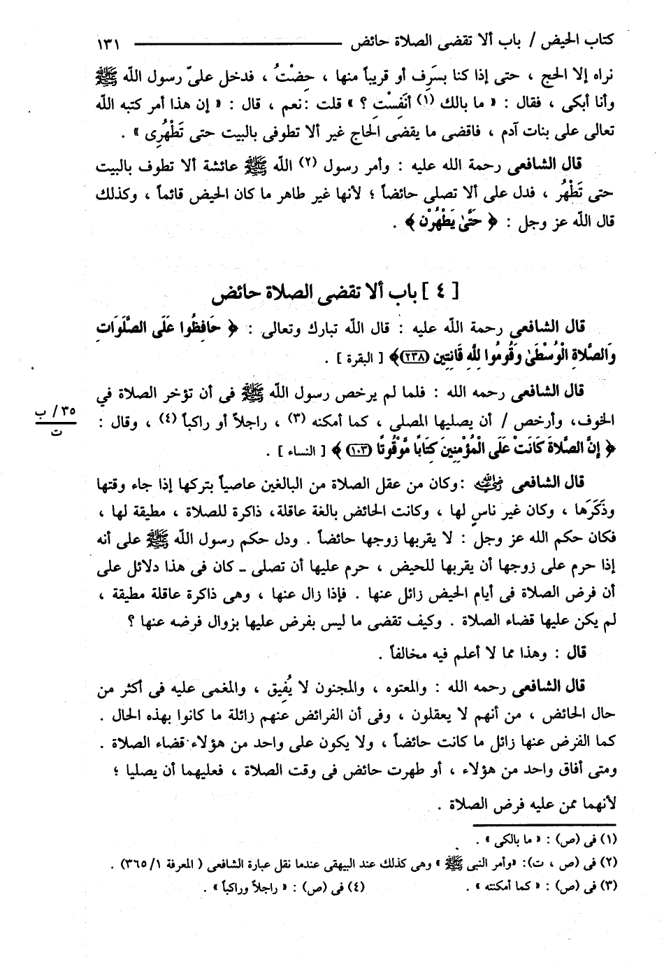 قَالَ الشَّافِعِيُّ : وَأَمَرَ رَسُولُ اللَّهِ - صلى الله عليه وسلم - عَائِشَةَ أَنْ لاَ تَطُوفَ بِالْبَيْتِ حَتَّى تَطْهُرَ , فَدَلَّ عَلَى أَنْ لاَ تُصَلِّيَ حَائِضًا ; لِأَنَّهَا غَيْرُ طَاهِرٍ مَا كَانَ الْحَيْضُ قَائِمًا وَكَذَلِكَ قَالَ اللَّهُ عَزَّ وَجَلَّ : { حَتَّى يَطْهُرْنَ ? .