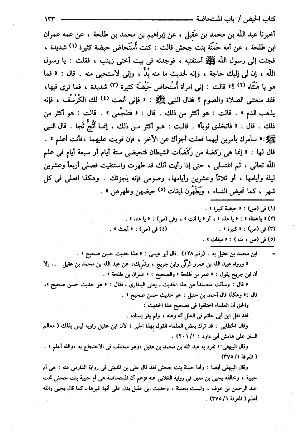 أَخْبَرَنَا عَبْدُ اللَّهِ بْنُ مُحَمَّدِ بْنِ عَقِيلٍ عَنْ إبْرَاهِيمَ بْنِ مُحَمَّدِ بْنِ طَلْحَةَ عَنْ عَمِّهِ عِمْرَانَ بْنِ طَلْحَةَ عَنْ أُمِّهِ { حَمْنَةَ بِنْتِ جَحْشٍ قَالَتْ كُنْت أُسْتَحَاضُ حَيْضَةً كَثِيرَةً شَدِيدَةً فَجِئْت إلَى رَسُولِ اللَّهِ - صلى الله عليه وسلم - أَسْتَفْتِيهِ فَوَجَدْتُهُ فِي بَيْتِ أُخْتِي زَيْنَبَ فَقُلْت يَا رَسُولَ اللَّهِ إنَّ لِي إلَيْك حَاجَةً وَإِنَّهُ لَحَدِيثٌ مَا مِنْهُ بُدٌّ وَإِنِّي لاََسْتَحْيِي مِنْهُ قَالَ : فَمَا هُوَ يَا هَنْتَاهُ قَالَتْ إنِّي امْرَأَةٌ أُسْتَحَاضُ حَيْضَةً كَثِيرَةً شَدِيدَةً فَمَا تَرَى فِيهَا فَقَدْ مَنَعْتنِي الصَّلاَةَ وَالصَّوْمَ فَقَالَ النَّبِيُّ - صلى الله عليه وسلم - فَإِنِّي أَنْعَتُ لَكِ الْكُرْسُفَ فَإِنَّهُ يُذْهِبُ الدَّمَ قَالَتْ هُوَ أَكْثَرُ مِنْ ذَلِكَ قَالَ : فَتَلَجَّمِي . قَالَتْ هُوَ أَكْثَرُ مِنْ ذَلِكَ قَالَ : فَاِتَّخِذِي ثَوْبًا قَالَتْ : هُوَ أَكْثَرُ مِنْ ذَلِكَ إنَّمَا أَثُجُّ ثَجًّا قَالَ النَّبِيُّ - صلى الله عليه وسلم - سَآمُرُك بِأَمْرَيْنِ أَيُّهُمَا فَعَلْت أَجْزَأَكِ عَنْ الْآخَرِ فَإِنْ قَوِيَتْ عَلَيْهِمَا فَأَنْتِ أَعْلَمُ قَالَ لَهَا إنَّمَا هِيَ رَكْضَةٌ مِنْ رَكَضَاتِ الشَّيْطَانِ فَتَحَيَّضِي سِتَّةَ أَيَّامٍ , أَوْ سَبْعَةَ أَيَّامٍ فِي عِلْمِ اللَّهِ تَعَالَى ثُمَّ اغْتَسِلِي حَتَّى إذَا رَأَيْت أَنَّك قَدْ طَهُرْت واستنقيت فَصَلِّي أَرْبَعًا وَعِشْرِينَ لَيْلَةً وَأَيَّامَهَا , أَوْ ثَلاَثًا وَعِشْرِينَ وَأَيَّامَهَا وَصُومِي فَإِنَّهُ يُجْزِئُكِ وَهَكَذَا افْعَلِي فِي كُلِّ شَهْرٍ كَمَا تَحِيضُ النِّسَاءُ وَيَطْهُرْنَ لِمِيقَاتِ حَيْضِهِنَّ وَطُهْرِهِنَّ ?@
